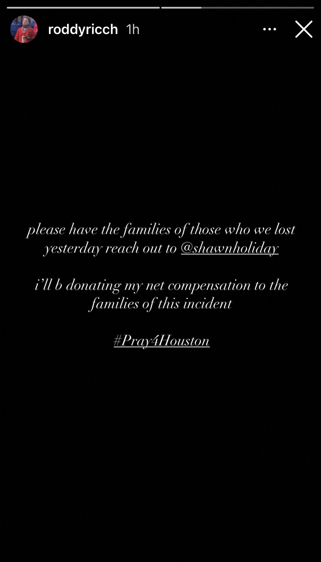 ロディ・リッチはアストロワールドフェスに出演した翌日、インスタグラムのストーリーズを更新。そこには「昨日亡くなった人の家族の方はショーン・ホリデーに連絡するように拡散してください」と、コロンビア・レコードの共同責任者を務め、現在は自身のマネージメントを担当するショーン・ホリデーに連絡するよう呼びかけると、「僕の報酬はこの事件の遺族に寄付します。#ヒューストンに祈りを」と、自身のギャラを全額寄付することを発表。