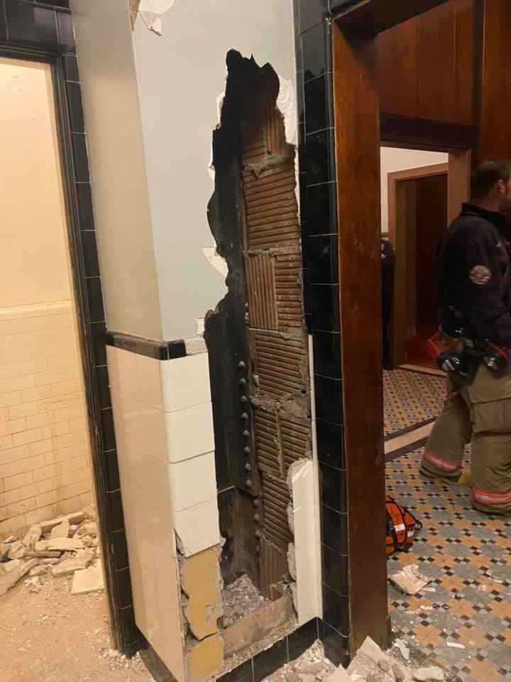 一体どのようにして中に入ったのか不明なものの、レスキュー隊はランドマーク・シアターに到着後、壁に穴を開け、光ファイバーカメラを使用して男性の位置を確認し、何層もの乾式壁と構造用粘土タイルを慎重に切断。そして無事に柱の中から男性を救助。無事に柱の中から男性を救助したのだが、なぜか男性は裸だったという。救助後の壁の写真がこちら。