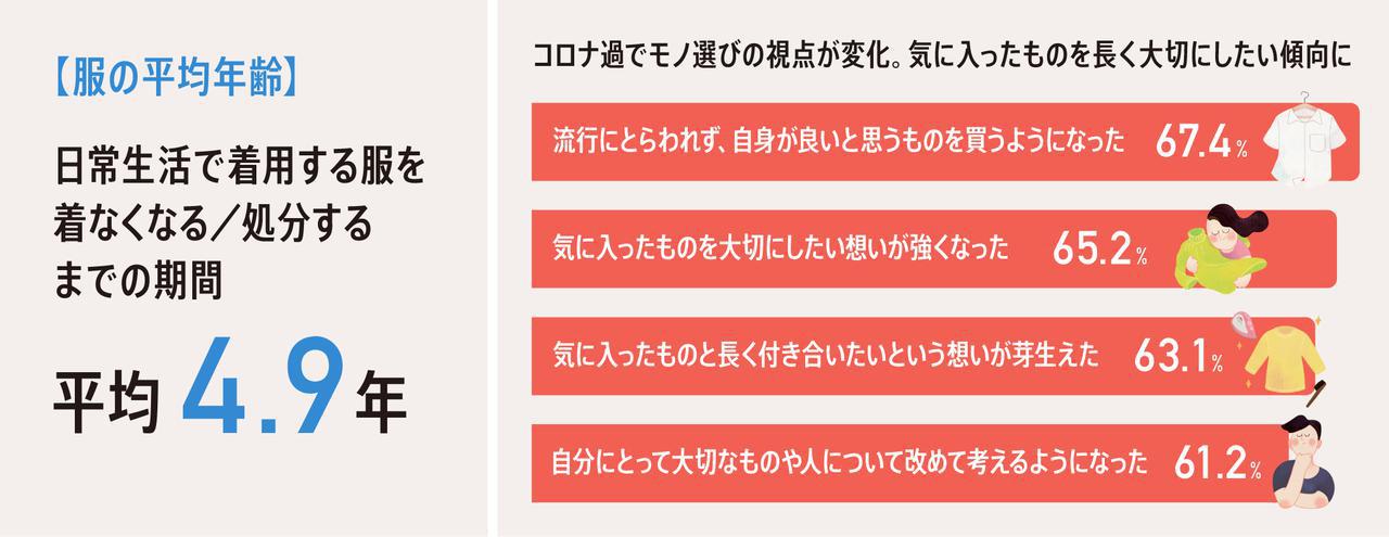 また、日常で着用している服を着なくなったり、処分したりするまでの平均年数が4.9年であることが判明。その一方で、63.3%が「これからもずっと着たい服がある」と回答しており、着続けたい年数は6.3年と、服の平均年齢が足りていないという結果に。