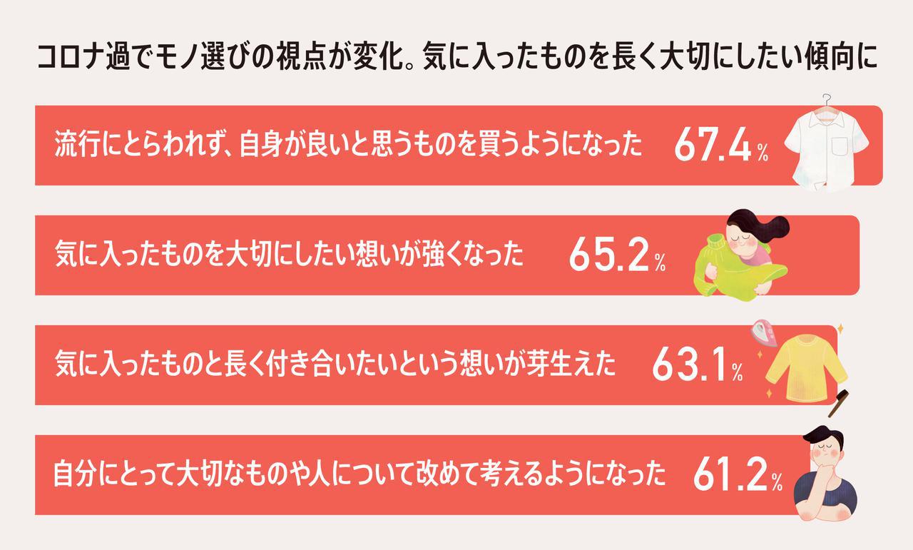 その調査結果では、コロナ禍で服に対しての意識や行動も変化しており、「流行にとらわれず、自身が良いと思うものを買うようになった(67.4%)」、「気に入ったものを大切にしたい想いが強くなった(65.2%)」、「気に入ったものと長く付き合いたいという想いが芽生えた(63.1%)」 など、早いサイクルで消費していくのではなく、長く大切にしたいという傾向が見られた。