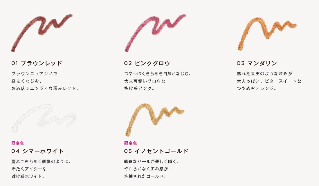 01ブラウンレッド/02ピンクグロウ/03マンダリン/04シマーホワイト(限定)/イノセントゴールド(限定)
