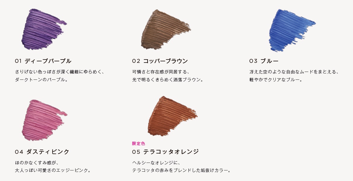 01ディープパープル/02コッパーブラウン/03ブルー/04ダスティピンク/05テラコッタオレンジ(限定)