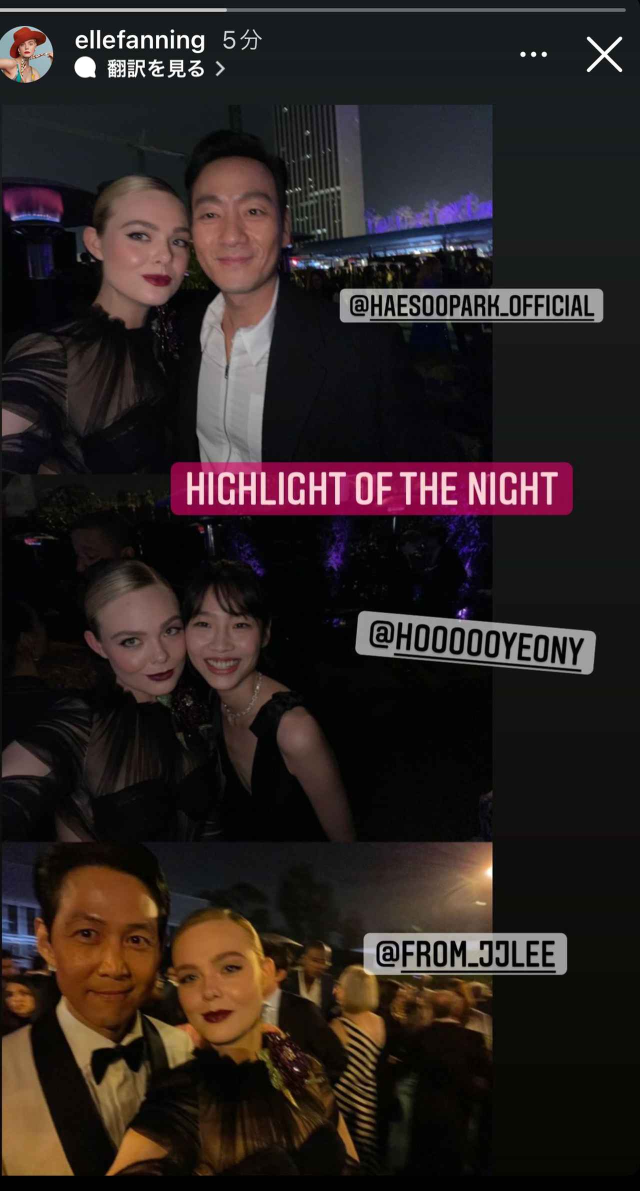 エルも『イカゲーム』に夢中になった1人だったようで、彼女はこの日のレッドカーペットで、チョ・サンウ役のパク・ヘス、セビョク役のチョン・ホヨン、ソン・ギフン役のイ・ジョンジェの3人とそれぞれセルフィーを撮影。「この夜のハイライト」とコメントを添えてインスタグラムストーリーズに投稿した。