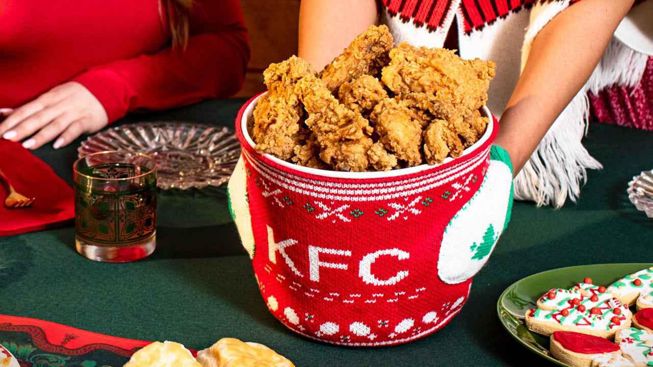 また、ホリデーシーズンを意識したデザインに「KFC」の文字が施されたセーターにはミトンが合体しているので、手を入れれば、バーレルの中のフライドチキンだけでなく手も一緒に温めることができる。