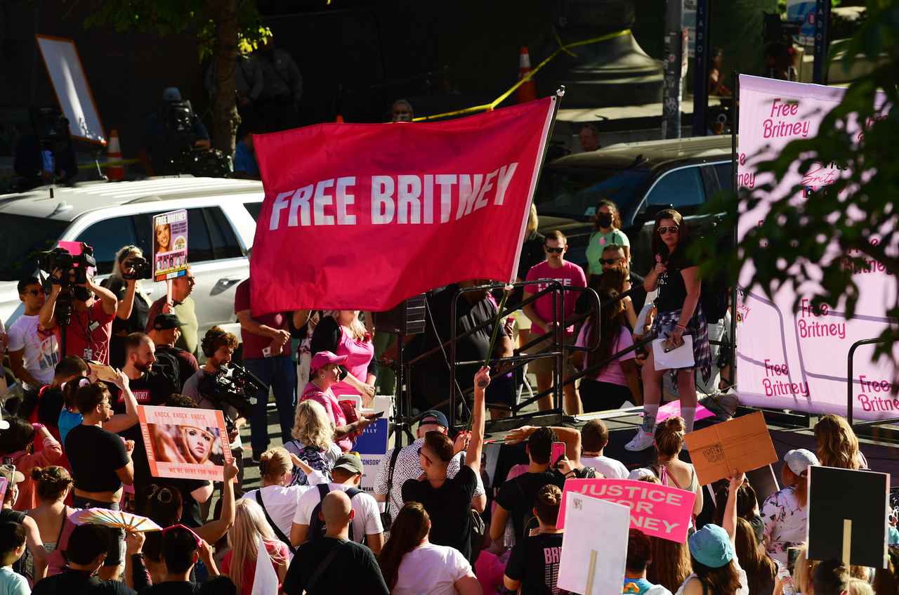 審問の当日、ブリトニー・スピアーズの解放を求めて米カリフォルニア州ロサンゼルスで行進を行なったファンたち。