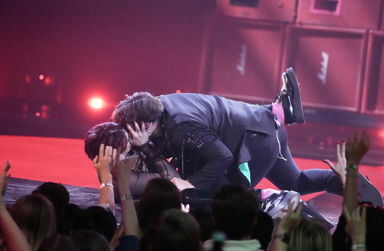 相手の性別やジェンダーにかかわらず人を好きになるパンセクシャル(全性愛者)であることをカミングアウトしているヤングブラッドがパフォーマンス中に男性ギタリストと熱いキスを交わすと、会場からは大歓声が沸き起こった。