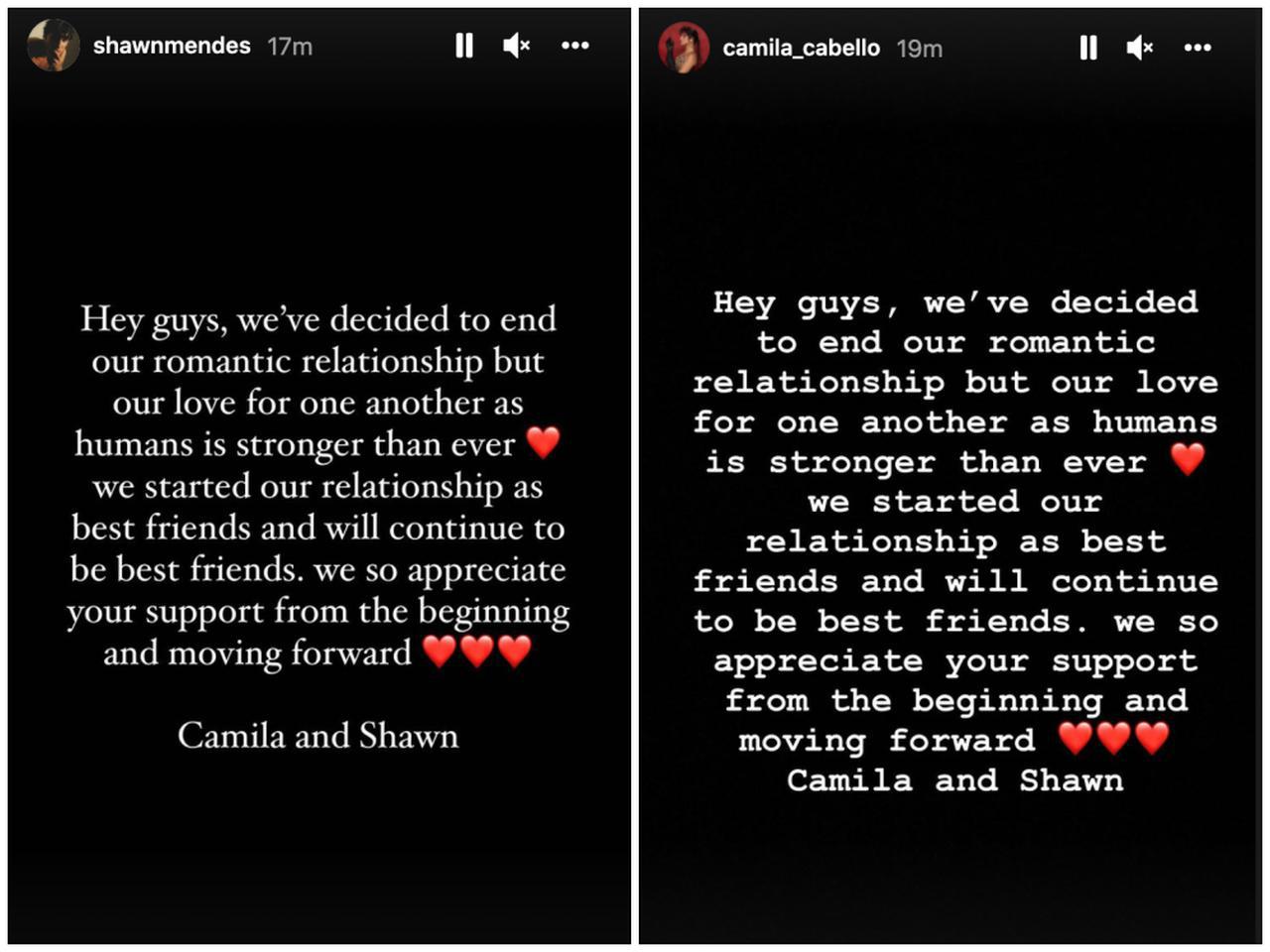 「皆さん、私たちは恋愛関係を終わらせることを決めましたが、人間としてのお互いへの愛はこれまで以上に強いものです。私たちは親友として関係を始め、これからも親友であり続けます。今までもこの先も応援してくれる皆さんには感謝しかありません。カミラ&ショーン」