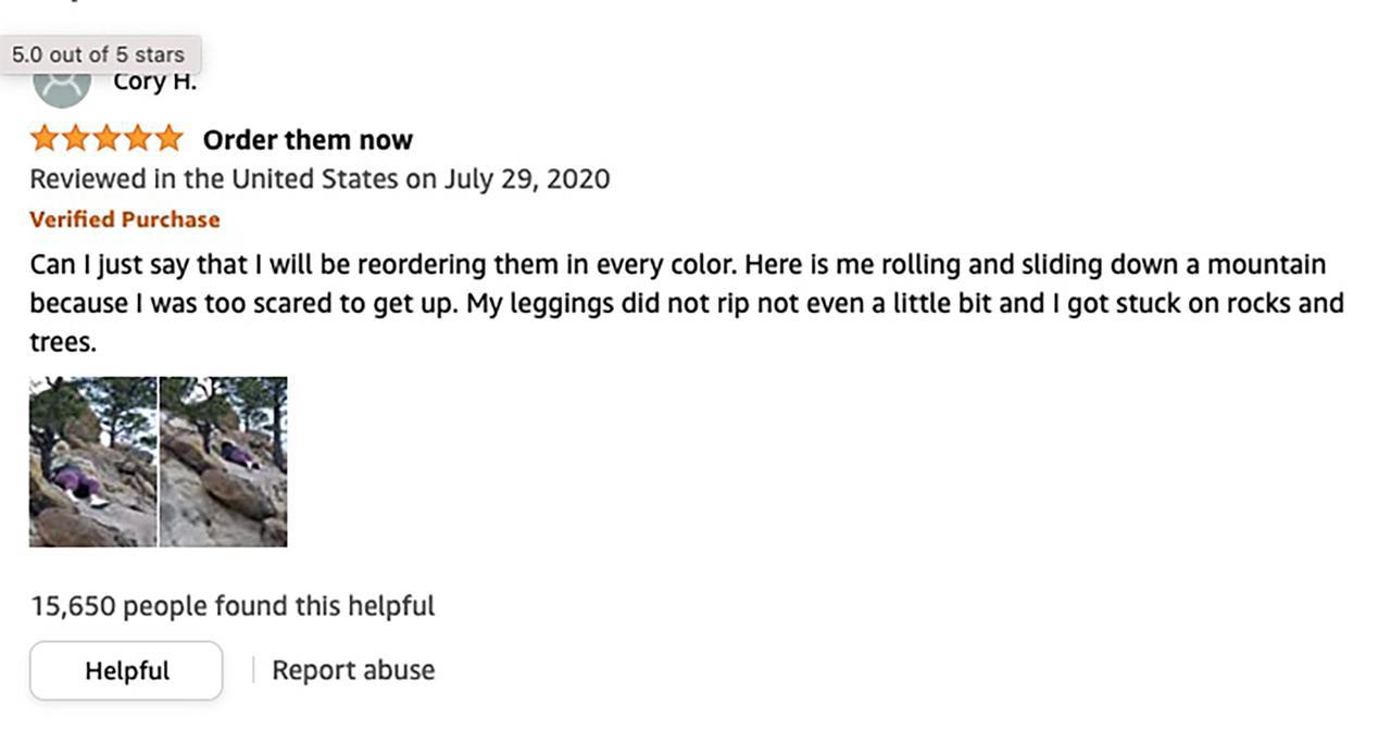 こんな過酷な状況で少しも破れなかったなんてたしかにかなり優秀だが、写真のインパクトが強過ぎて話が頭に入ってこない。ただし、1万5,000人以上が彼女のレビューが「参考になった」と評価しており、なかには「山から滑り落ちるレギンス女性のレビューは正しかった。アマゾンで買ったこのレギンスは彼女が言っていたとおりの出来栄えだった」という別のユーザーによる書き込みもあった。(フロントロウ編集部)