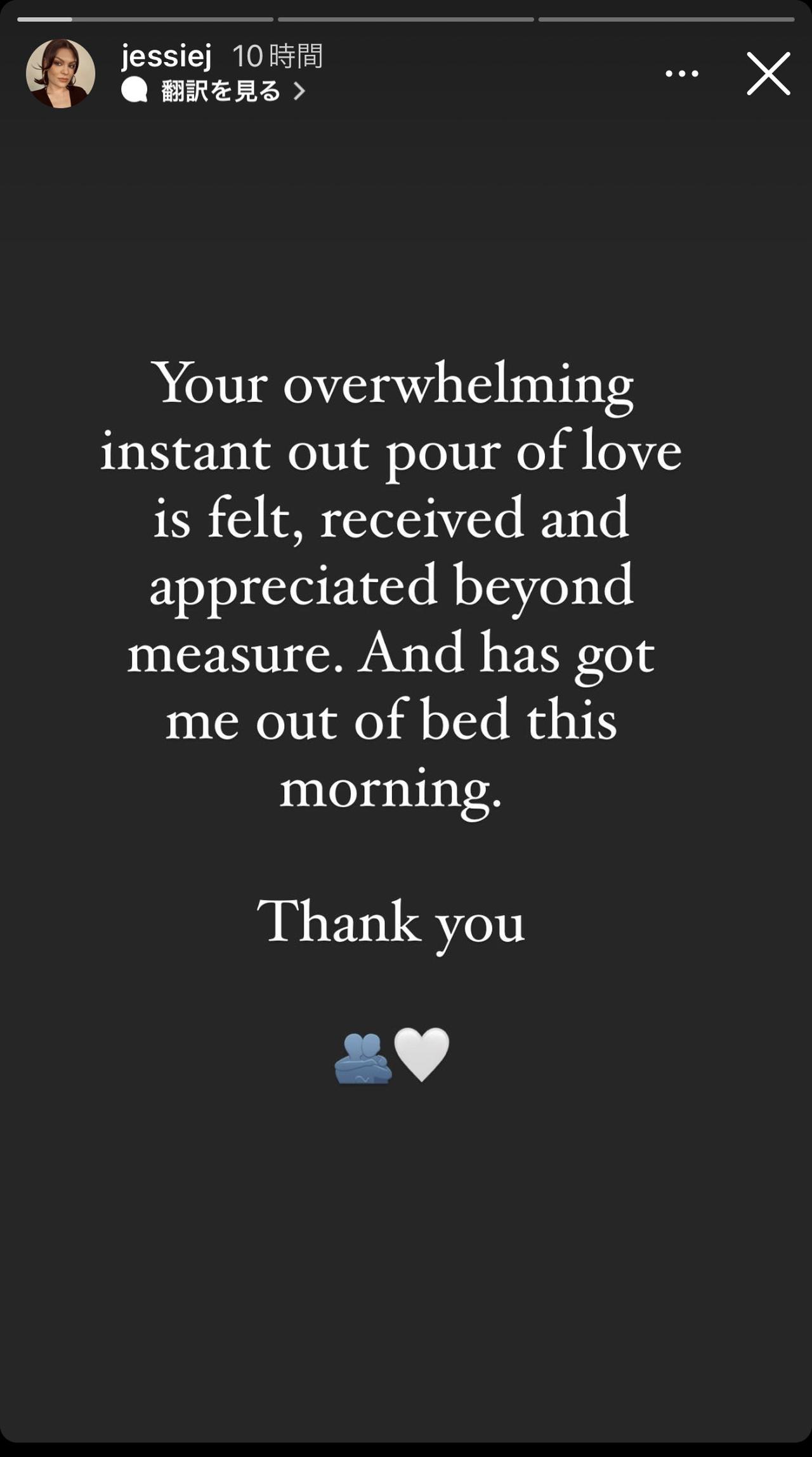 流産の悲しみをシェアしたジェシーの投稿には、多くの人たちから励ましのコメントが寄せられた。ジェシーは「みんなからの計り知れない溢れんばかりの愛を感じ、受け入れ、感謝しています。おかげで今朝はベッドから出られました。ありがとう」とインスタグラムストーリーズに感謝の言葉を綴った。