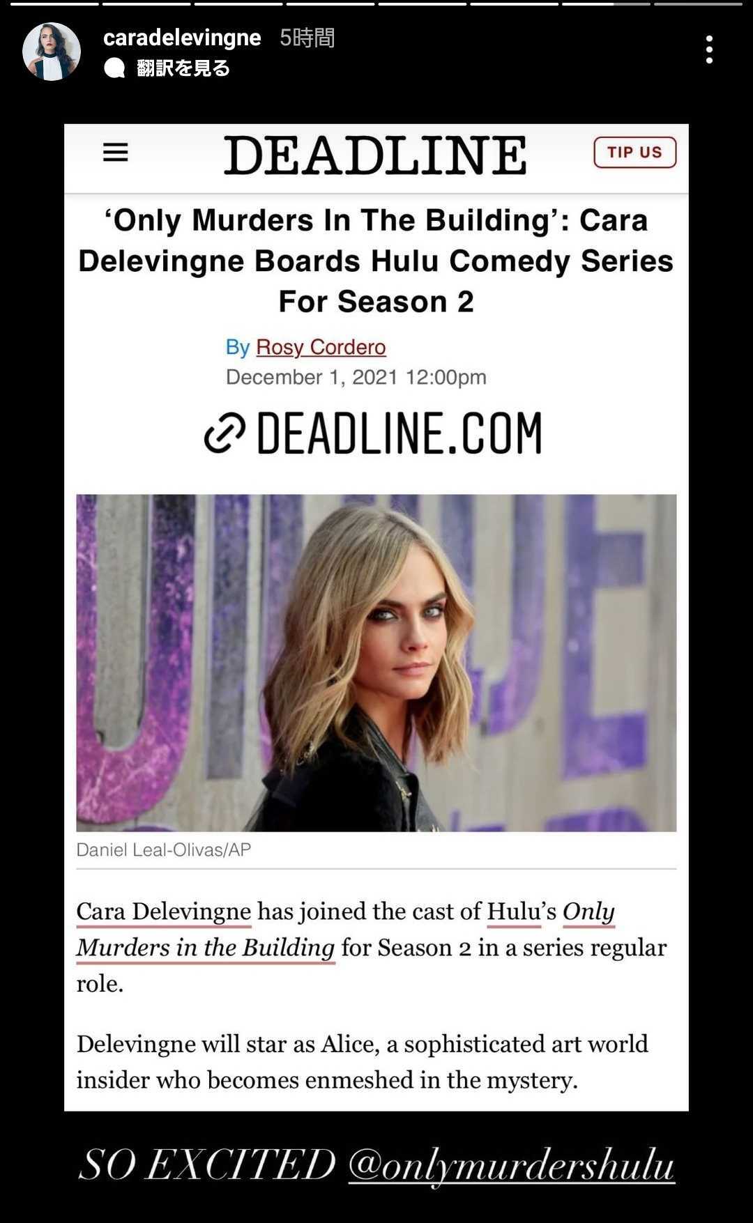 『マーダーズ・イン・ビルディング』のシーズン2に加わるのは、なんとカーラ・デルヴィーニュ。カーラはドラマに出演することについて「とてもワクワクしている」とインスタグラムでコメント。