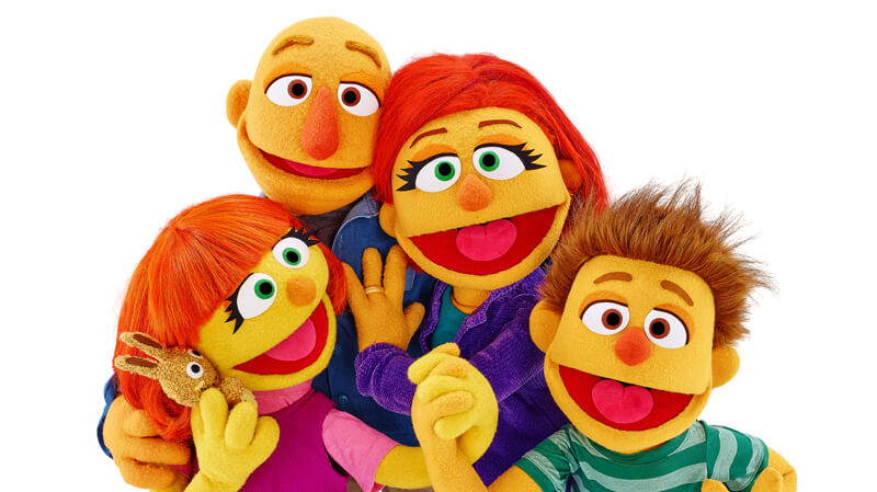 自閉症の特性があるジュリア(左下)は、同じ特性と共に生きる家族に1人ではないというメッセージを発信し、自閉症に関する正しい知識を広げるという役割を果たしている。ジュリアの登場までに約10年の研究や分析を要したという。