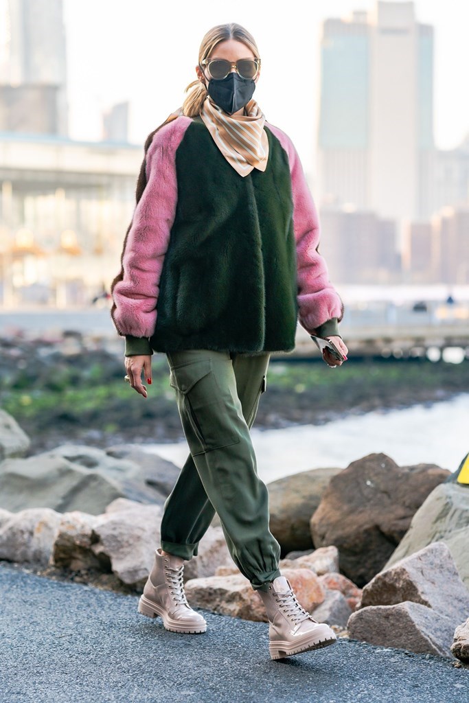 ミリタリーグリーンのカーゴパンツに、エコファージャケットを合わせた旬なコーデを披露した、ファッショニスタのオリヴィア・パレルモ。艶やか素材でキレイめにも見せられるカーゴパンツはZara(ザラ)のアイテム。スカーフとレースアップブーツをベージュで統一してスタイリッシュにまとめて。