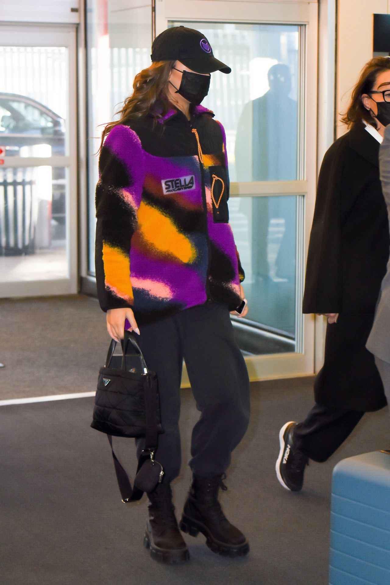 パープルカラーコーデがお気に入りのヘイリーはこの日、Stella McCartney(ステラ・マッカートニー)のエコファージャケットにPrada(プラダ)のバッグとブーツを合わせたストリートルックを披露。コーデの仕上げはドラマ『ホークアイ』のキャップでアクセントを!