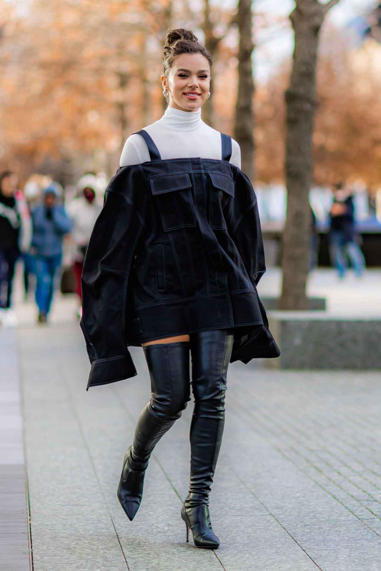 Vera Wang(ヴェラ・ワン)のオフショルワンピに、サイハイブーツを合わせたモードなコーデを披露したヘイリー。今季もオーバーサイズのアイテムはストリートでも人気。