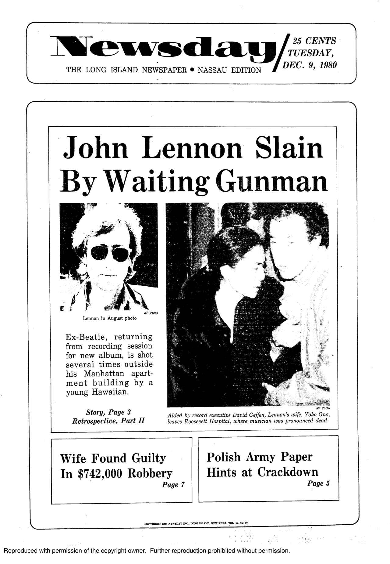 1980年12月9日のニューヨーク・ロングアイランドの日刊紙「ニューズデイ」の一面。見出しは、「John Lennon Slain by Waiting Gunman(待ち構えていたガンマンに殺されたジョン・レノン)」。