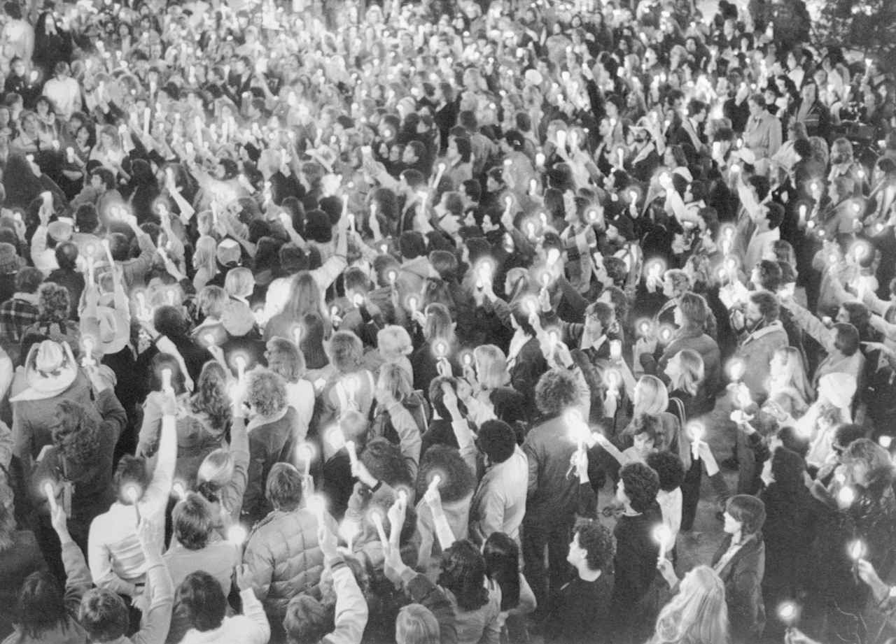 1980年12月9日、ロサンゼルスのセンチュリーシティで行われたジョン・レノン追悼のキャンドルセレモニーに参加した2,000人以上の群衆。