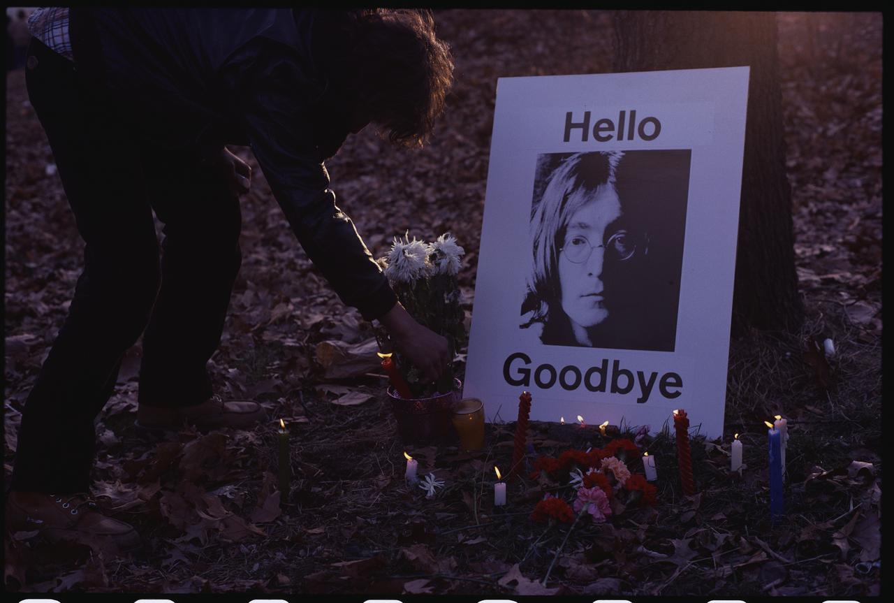 追悼集会でジョン・レノンの写真のそばに花を捧げる追悼者。ジョンの写真の上下には、ザ・ビートルズのヒット曲のひとつ「ハロー・グッドバイ」という言葉が。