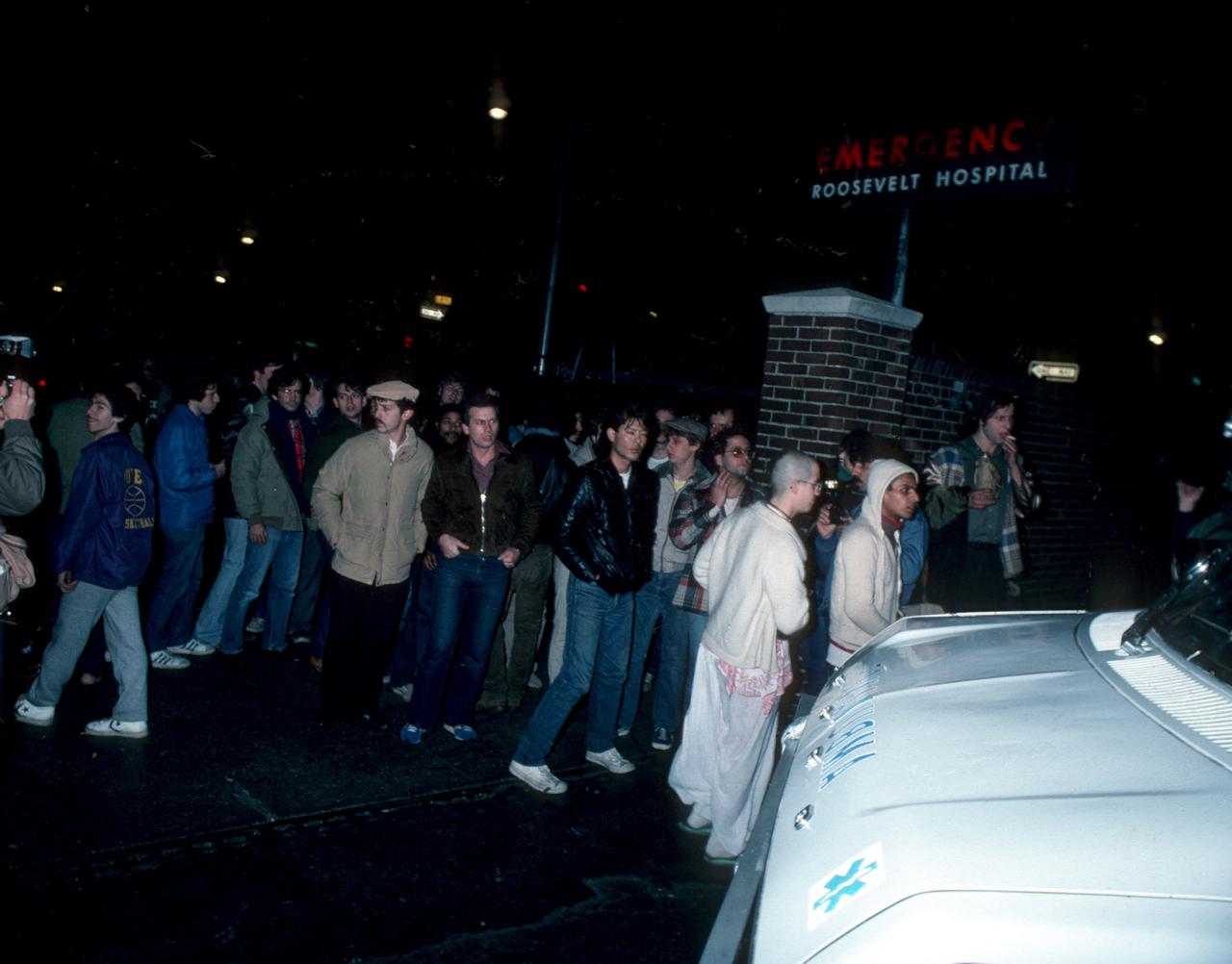 ジョン・レノンの死後、ニューヨーク市のルーズベルト病院にファンが集まった。
