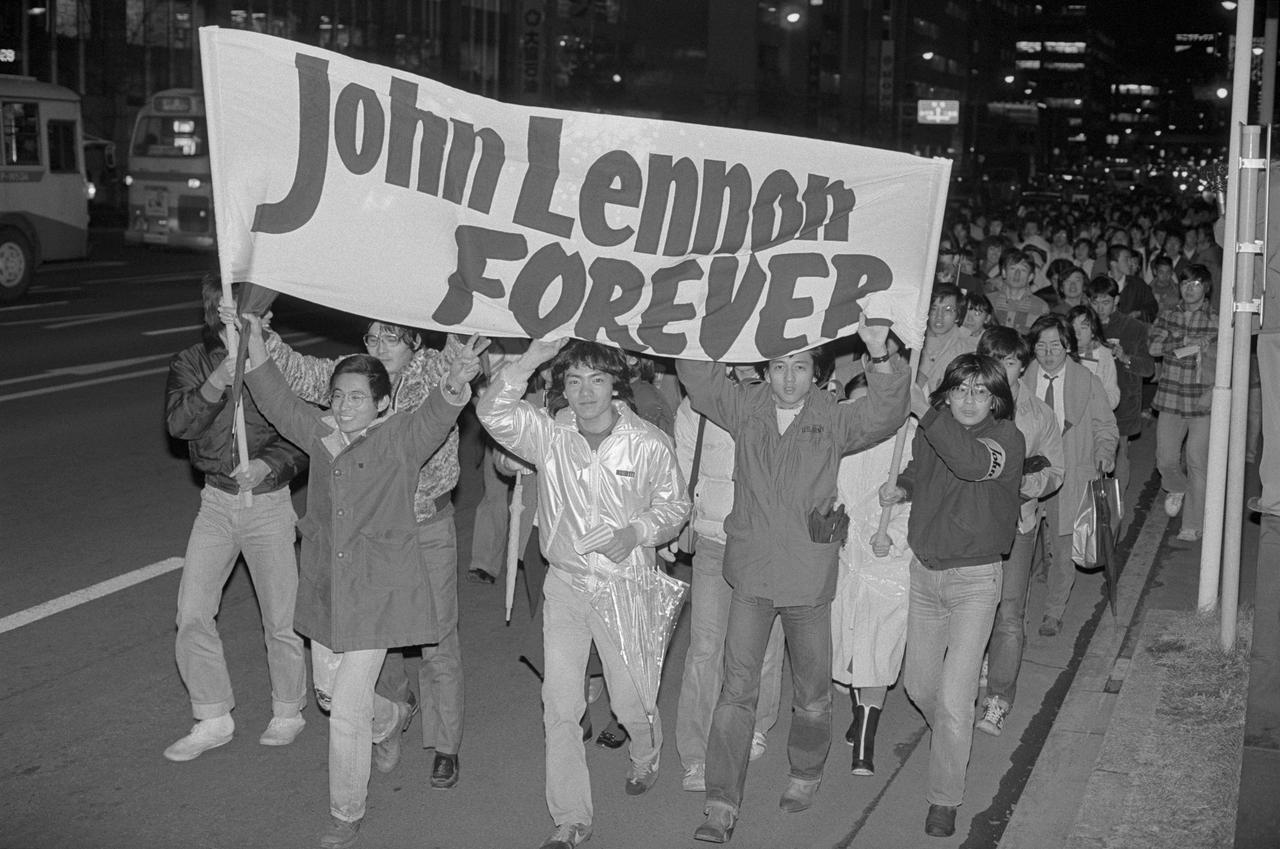 追悼の波は世界各地でも起き、当然、ここ日本でも。1980年12月24日、ジョン・レノンの死を悼み、「ジョン・レノン・フォーエバー」と書かれた横断幕を持って、東京・銀座の街を行進する約5千人のジョン・レノンのファン。