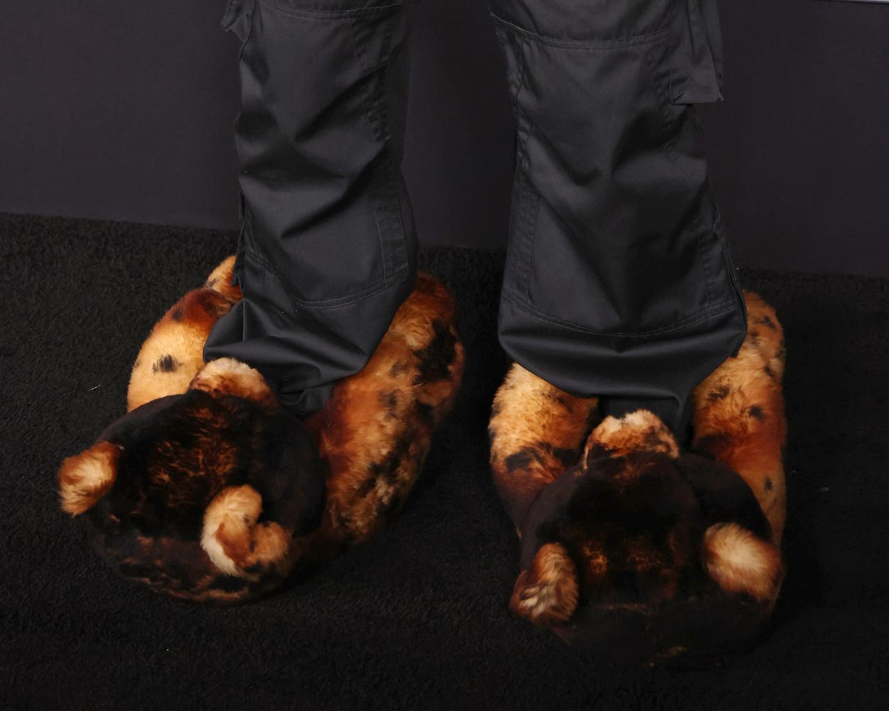 そして、この日の彼のコーデで特に目立っていたのが、テディベアのような形の巨大スリッポン。