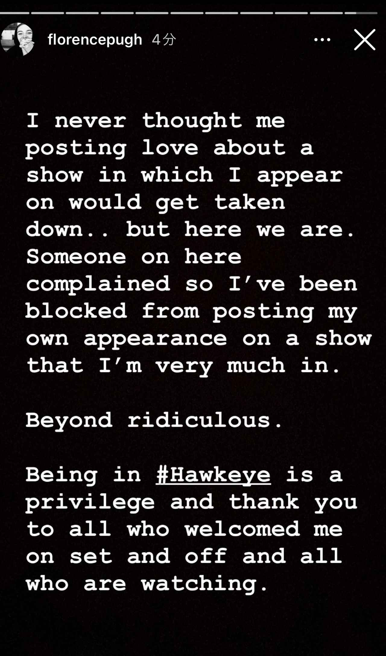 フローレンスによれば、これ以上『ホークアイ』の場面写真をインスタグラムに投稿することをストップされたという。しかしながら、フローレンスはこれに納得がいかなかったようで、インスタグラムストーリーズへの投稿で「自分が出演した番組への愛についての投稿が取り下げられてしまうだなんて思ってもみなかった」と報告した上で、不満を次のように綴った。