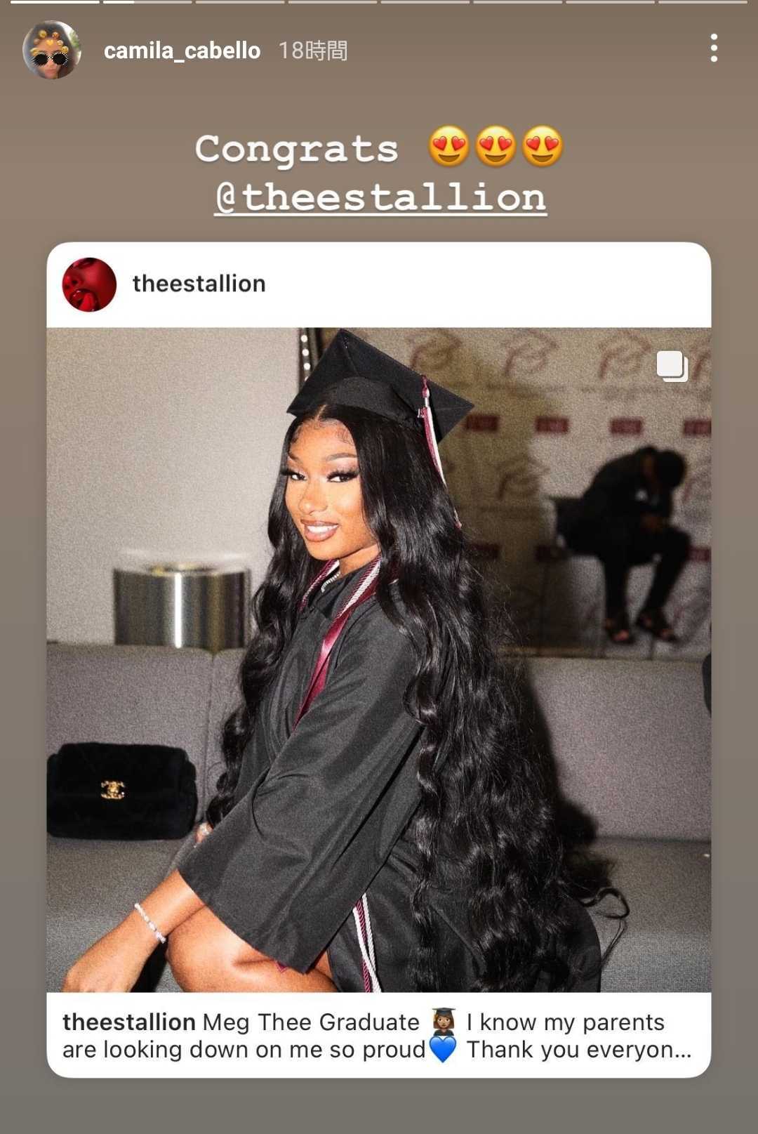 卒業式の様子をインスタグラムで公開したメーガンは、自身のステージネームであるメーガン・ジー・スタリオンと卒業という英語を組み合わせて、「メグ・ジー・グラデュエイト」と表現し、「両親は私を誇りに思って見守ってくれていると思う。みんな今日はたくさんの愛をありがとう」とコメント。
