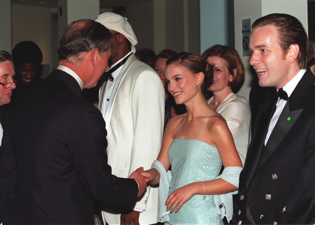 映画『スター・ウォーズ エピソード1/ファントム・メナス』のロンドンプレミアで、チャールズ皇太子に挨拶している様子。手前には共演者のユアン・マクレガーの姿が。