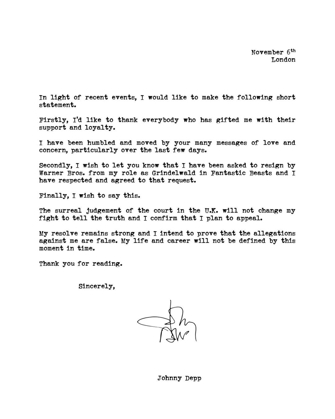 ジョニーは自身のインスタグラムで『ファンタスティック・ビースト』シリーズの製作・配給元であるワーナー・ブラザースの要請により、3作目『ファンタスティック・ビーストとダンブルドアの秘密』ではグリンデルバルド役を降りることを決断したと説明したほか、アンバーへのDV疑惑に関して、自身の潔白を晴らすために上訴する意志を明らかにした。以下が全訳。