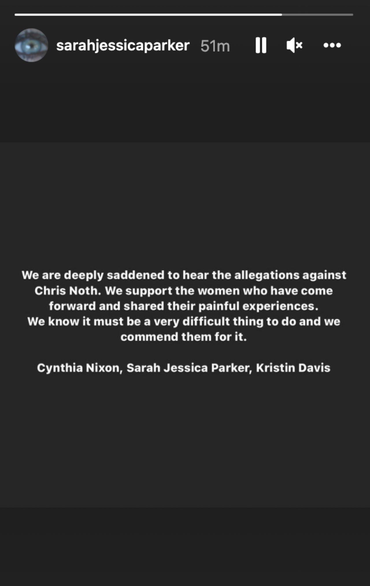 ドラマ『セックス・アンド・ザ・シティ』のミスター・ビッグ役でおなじみの俳優クリス・ノースに性的暴行疑惑が浮上していることを受けて、同シリーズでクリスと共演したキャリー役のサラ・ジェシカ・パーカー、ミランダ役のシンシア・ニクソン、シャーロット役のクリスティン・デイヴィスの3人が連名でコメントを出した。