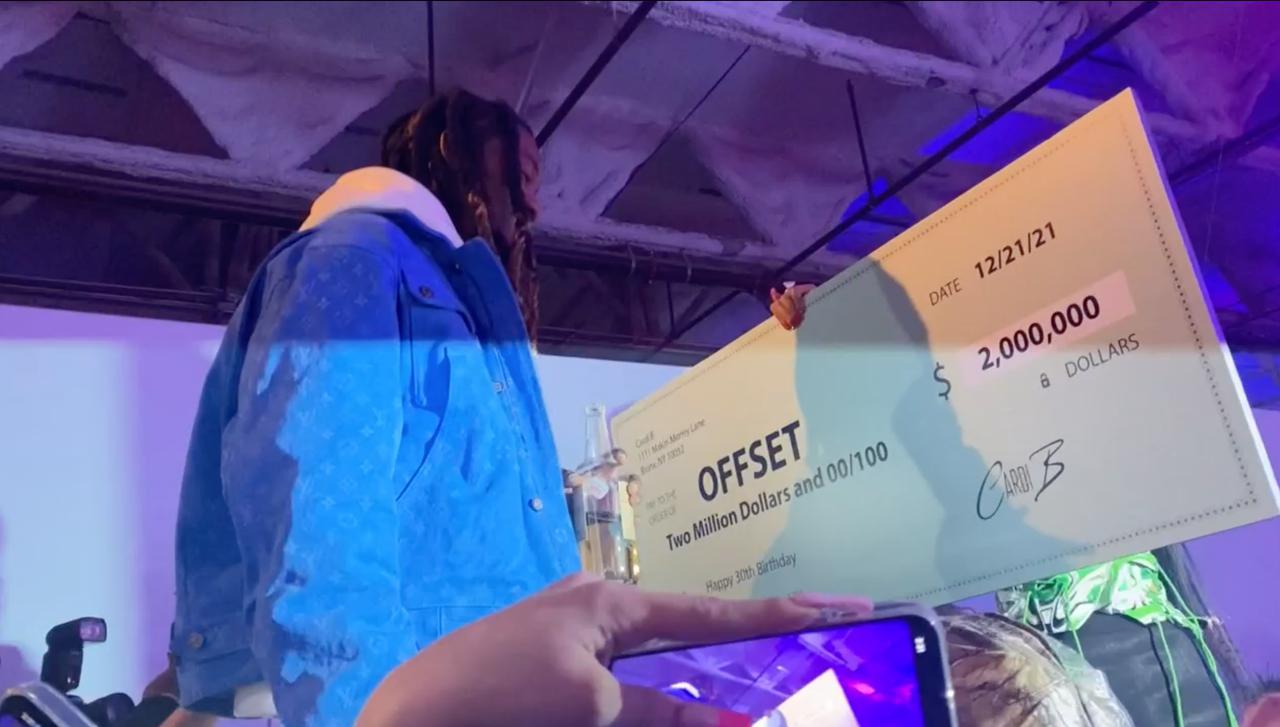 オフセットには今後色々なプロジェクトが控えていることから、“現金が役に立つ”と思ったカーディは、懸賞の当選者に渡されるような特大の小切手を用意。パーティーの会場に集まった人たちから大歓声が上がるなか、「2億円!2億円!2億円!」と言いながら小切手をオフセットに渡した。