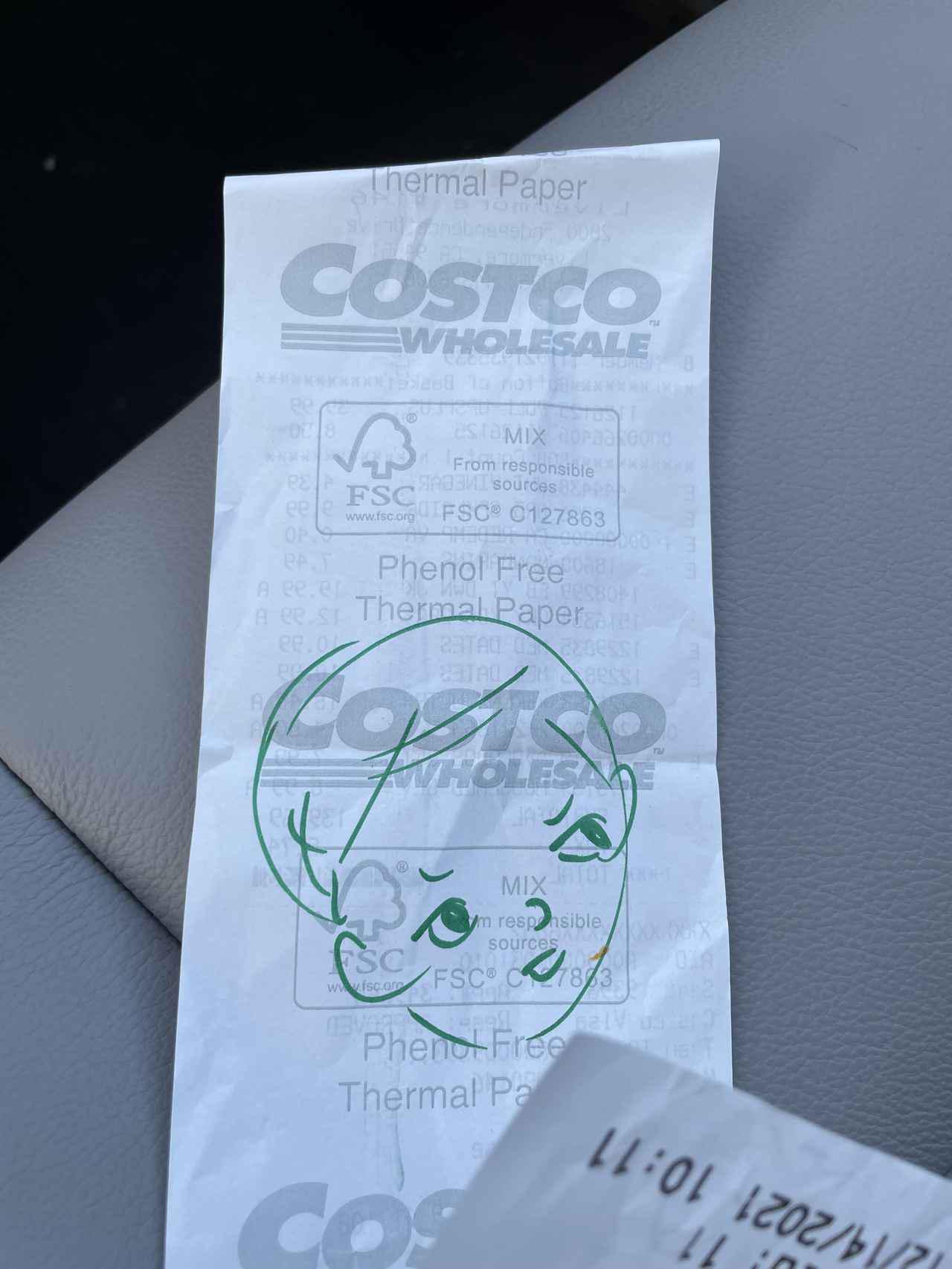 コストコでは、買い物の金額が多くないか、少なくないか、レシートの日付は当日であるかなどを確認するために、出口でレシートをチェックされ、チェックが終わると店員がマークをつけて証明する。このイラストはその時に描かれたもののよう。