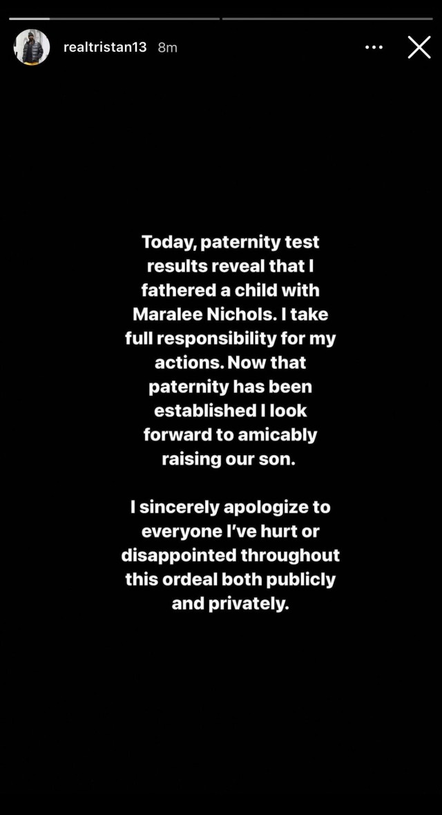 トリスタンは親子関係が明らかになったことについて「本日、親子鑑定の結果、私がマラリー・ニコルズとの間に子供をもうけたことが判明しました。全責任は私にあります。父子関係が確定した以上、円満な形で我々の息子を育てたいと思います。公私ともに、この試練の中で傷つけ失望させた方々に深くお詫び申し上げます」とインスタグラムを通して声明を出した。