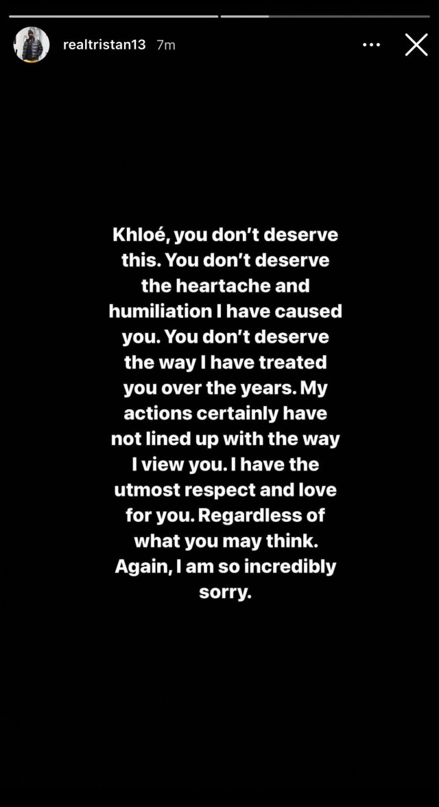 また、クロエと復縁していた際にマラリーを妊娠させたため、トリスタンはクロエに対してもメッセージを送っており、「クロエ、あなたはこんな扱いを受けるべきではありません。私のせいでこのような心痛と屈辱を経験するべきではないですし、私からこのような扱いを長年受けるべきではない。あなたに対する私の思いと私の行動は確かに一致していませんでした。私はあなたに最大限の尊敬と愛情を持っています。あなたがどう思おうとも。本当に申し訳ない」とインスタグラムのストーリーズで公開謝罪した。