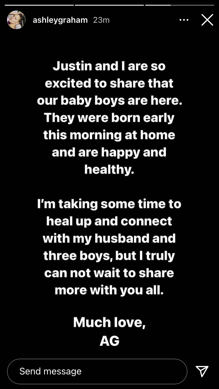 しかしその数日後、アシュリーは無事に双子を出産。アシュリーは双子を自宅で出産したようで、「ジャスティンと私は、私たちの男の子たちが誕生したことをお伝えできることをとても嬉しく思っています。今朝早く自宅で生まれ、幸せで健康です。 私は今、体を癒し、夫と3人の男の子たちと絆を深めるために時間をかけていますが、皆さんともっと分かち合うのが本当に待ち遠しいです。たくさんの愛を込めて、AG」とコメント。