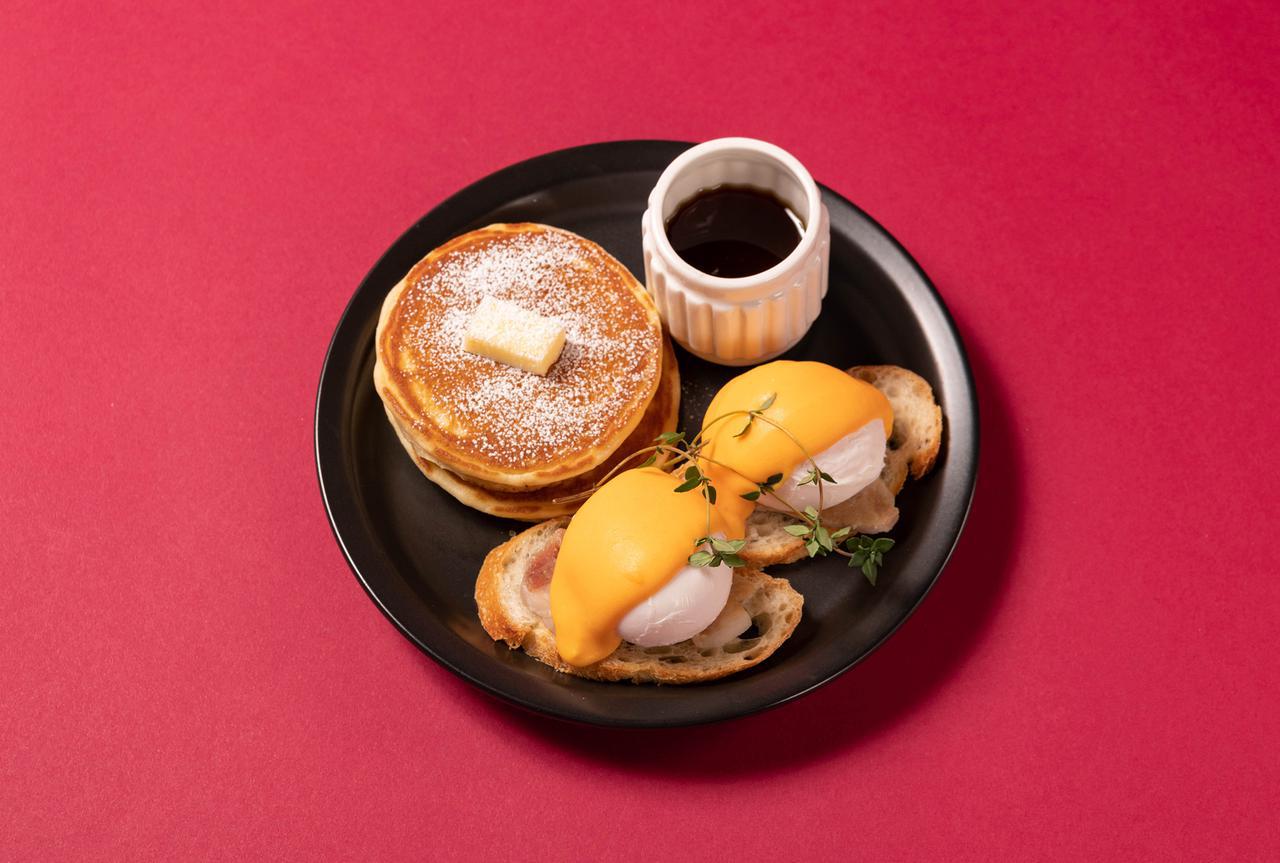 アフタヌーンティーセットの1段目には、ゴールドのスペシャルなコラボパッケージに入った「フォンデンテ・ピスタッキオ」をひとつ贅沢に使用し、2段目には濃厚なピスタチオプリン、マカロン、フルーツを盛り合わせ、3段目にはミニサイズのエッグベネディクトやパンケーキを用意した、豪華なセットに。
