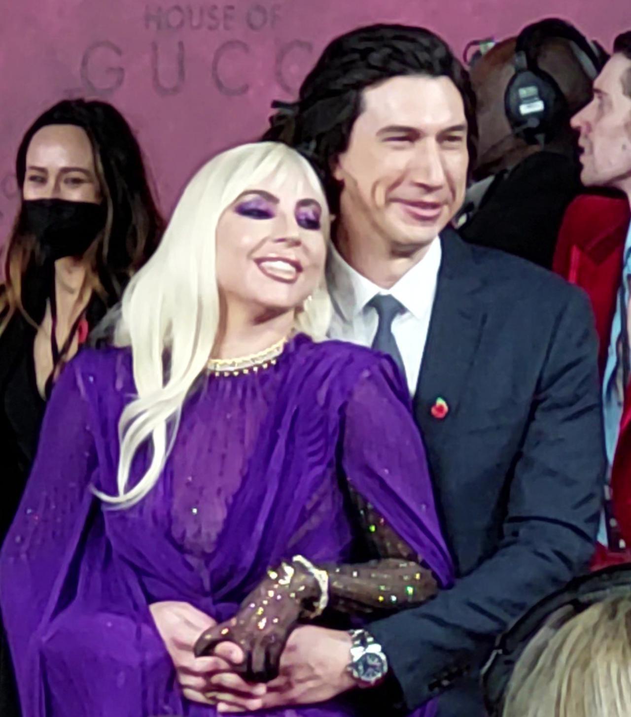 もちろんプレミアでは本領発揮。ドレスを自由自在に操り、パフォーマーでもあるガガとしてのセンスを見せつけた。また、劇中の夫であるアダムとの仲良しショットも。