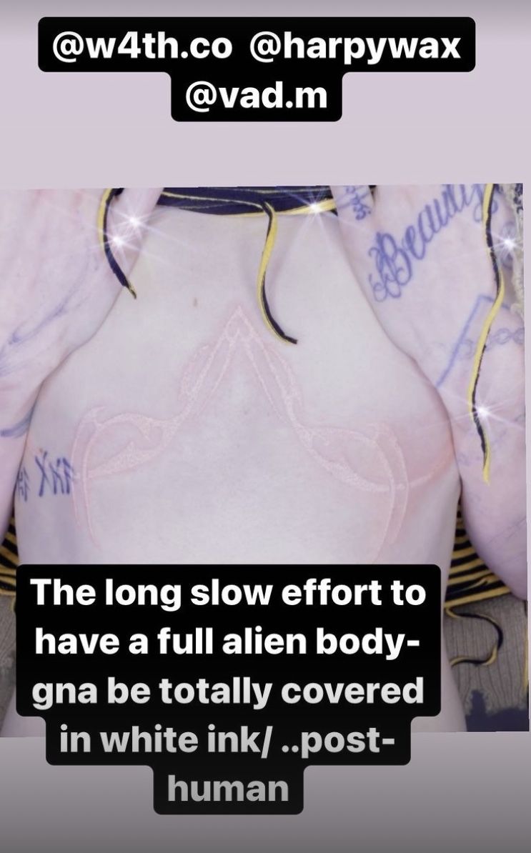 グライムスは、“エイリアンの体”を目指しているため、ホワイトインクのタトゥーを体に入れまくっているようで、「完全なエイリアンの体になるための長くゆっくりした努力です。完全に白いインクで覆われます。ポストヒューマンです」とインスタグラムで明かした。