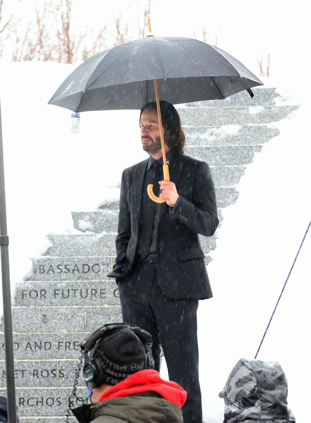 ここ最近のニューヨークでは雪が降っていたため、フランクリン D. ルーズベルト・フォー・フリーダムズ・パークで行なわれた撮影も雪景色。元々雪がシーンに必要で、さらに人工で雪を足すなどしたのか、雪が降ったからそれを利用したのかは不明だが、『ジョン・ウィック』の世界に雪景色が登場するのはワクワクしてしまう。