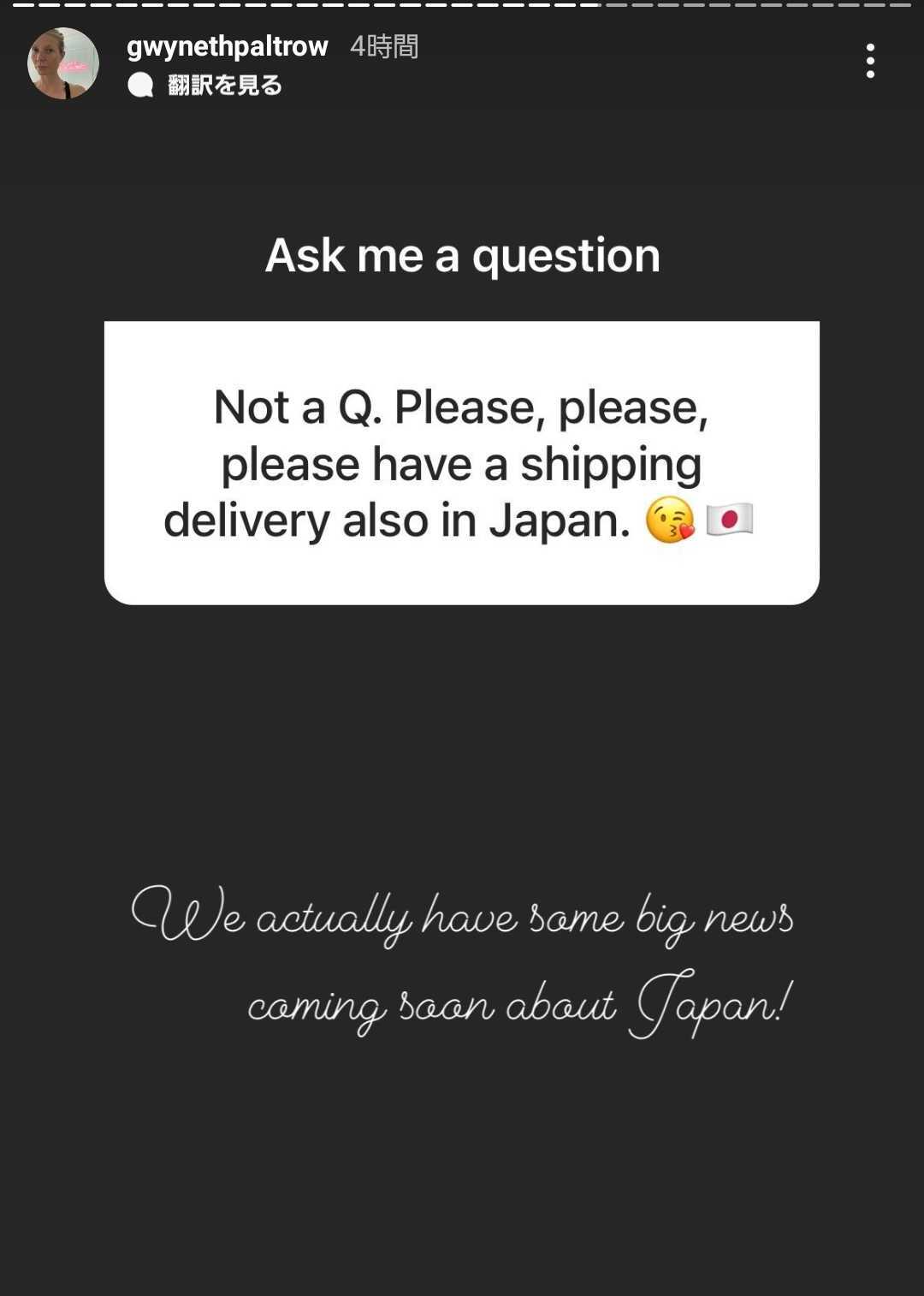 そこには、「質問ではないですが、日本にも配送してください」とのお願いが。そのお願いを見たグウィネスは、「じつは近々、日本に関するビッグニュースがあるんです!」と、あるプロジェクトを計画していることを明かした。