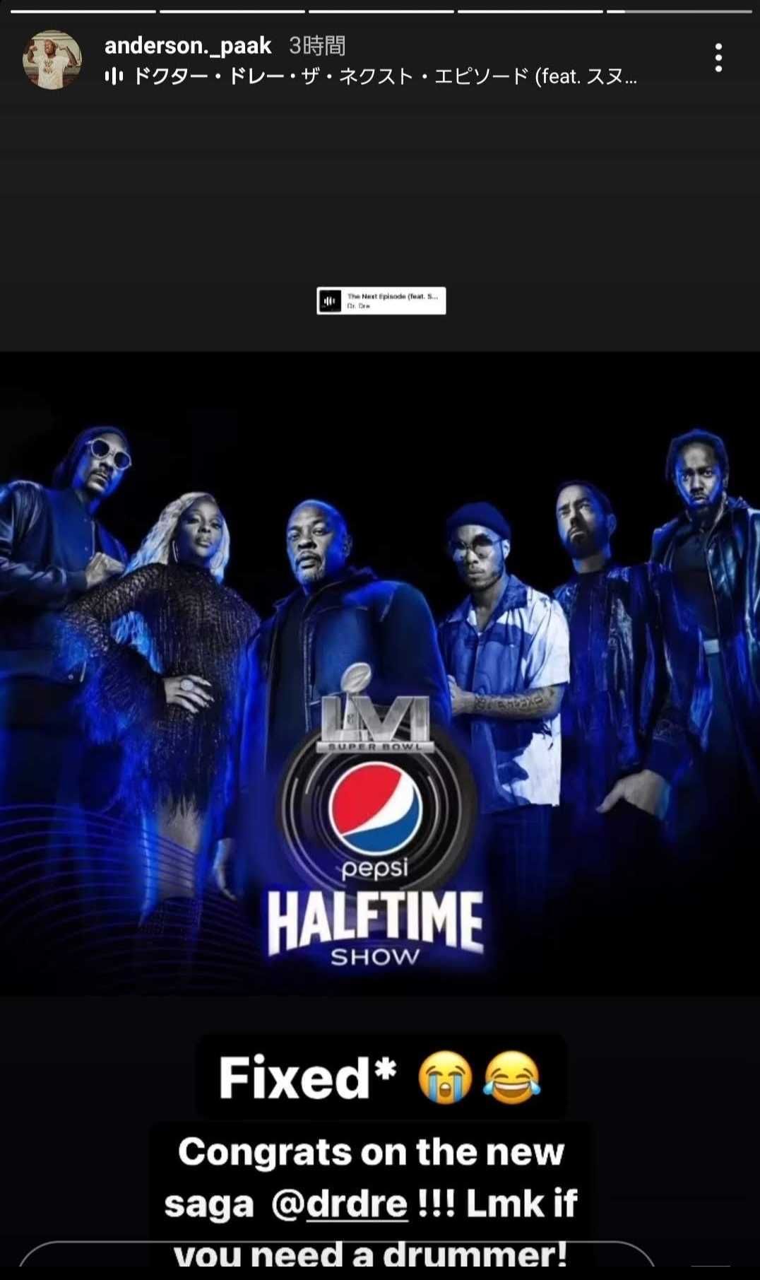 アンダーソンは、今回のハーフタイムショーのパフォーマーが決定すると、自身のインスタグラムで「新しい歴史を作るドクター・ドレーにおめでとう!もしドラマーが必要なら教えてください」と、出演したいがために自らプロモーション。