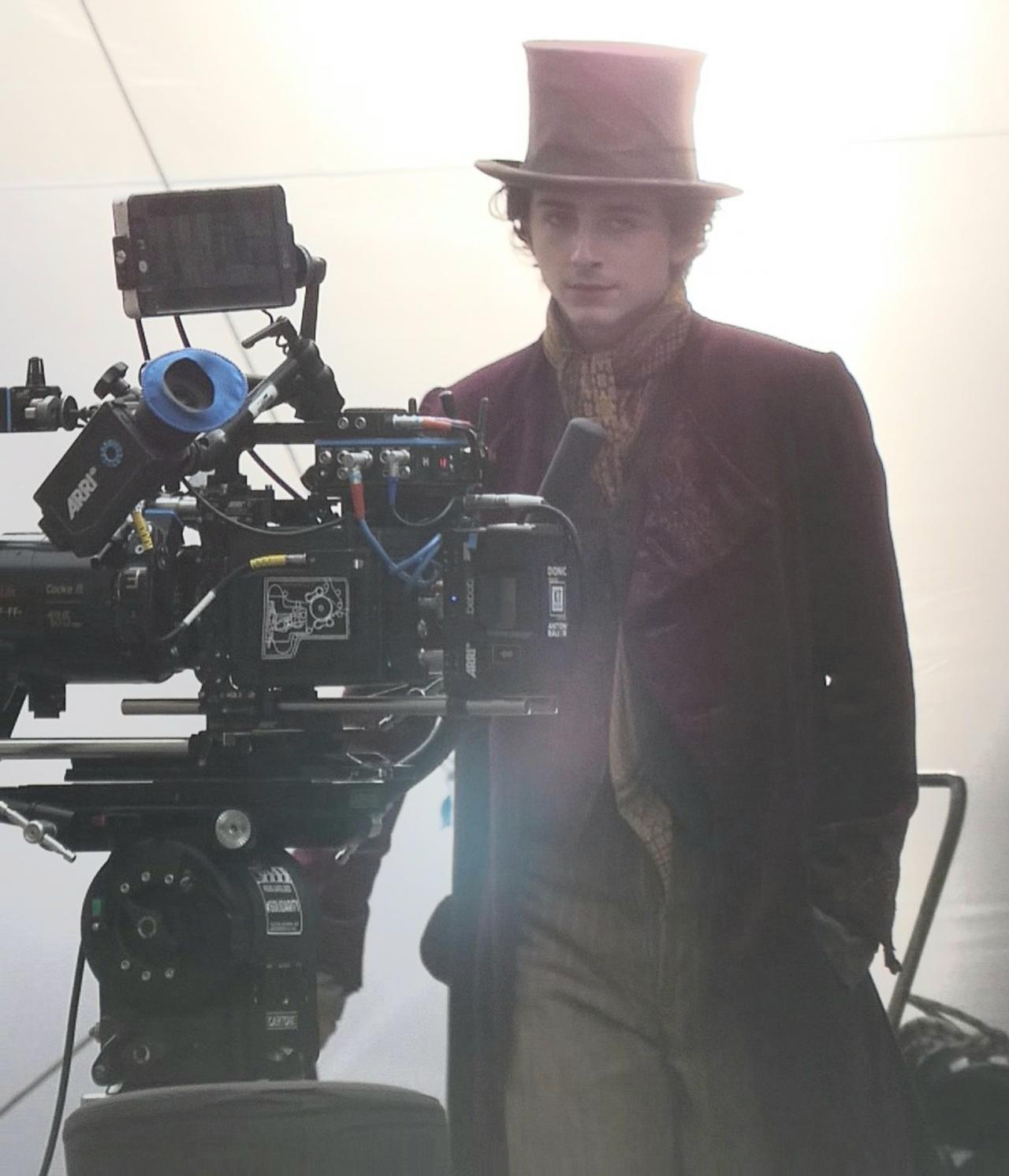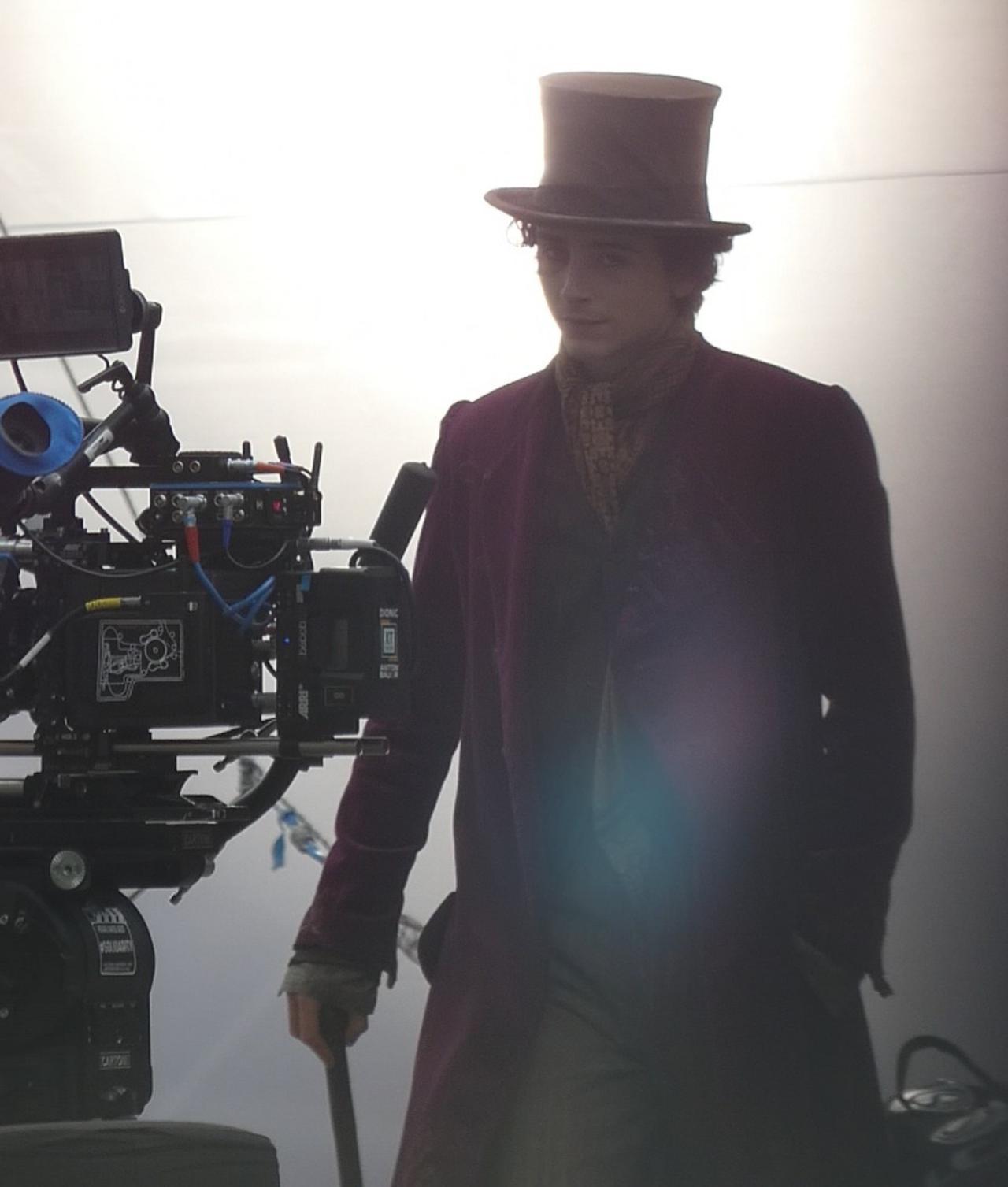 ウォンカの衣装で杖を持って歩く姿は作品への期待をあおるが、シーンの撮影を終え、衣装のままカメラチェックをするティモシーの姿もまた非常にフォトジェニック。