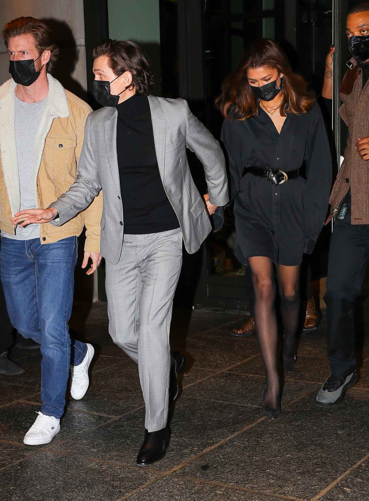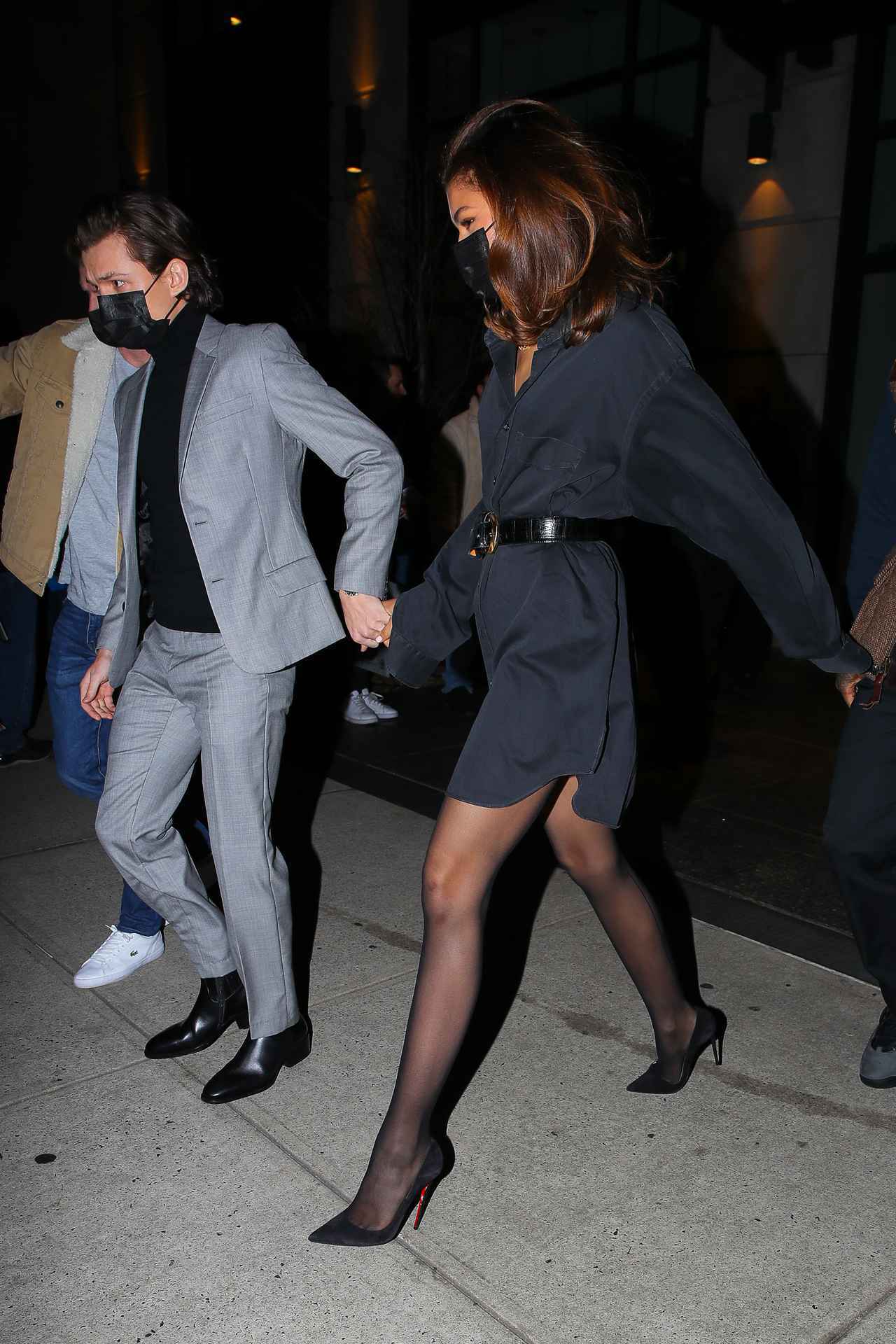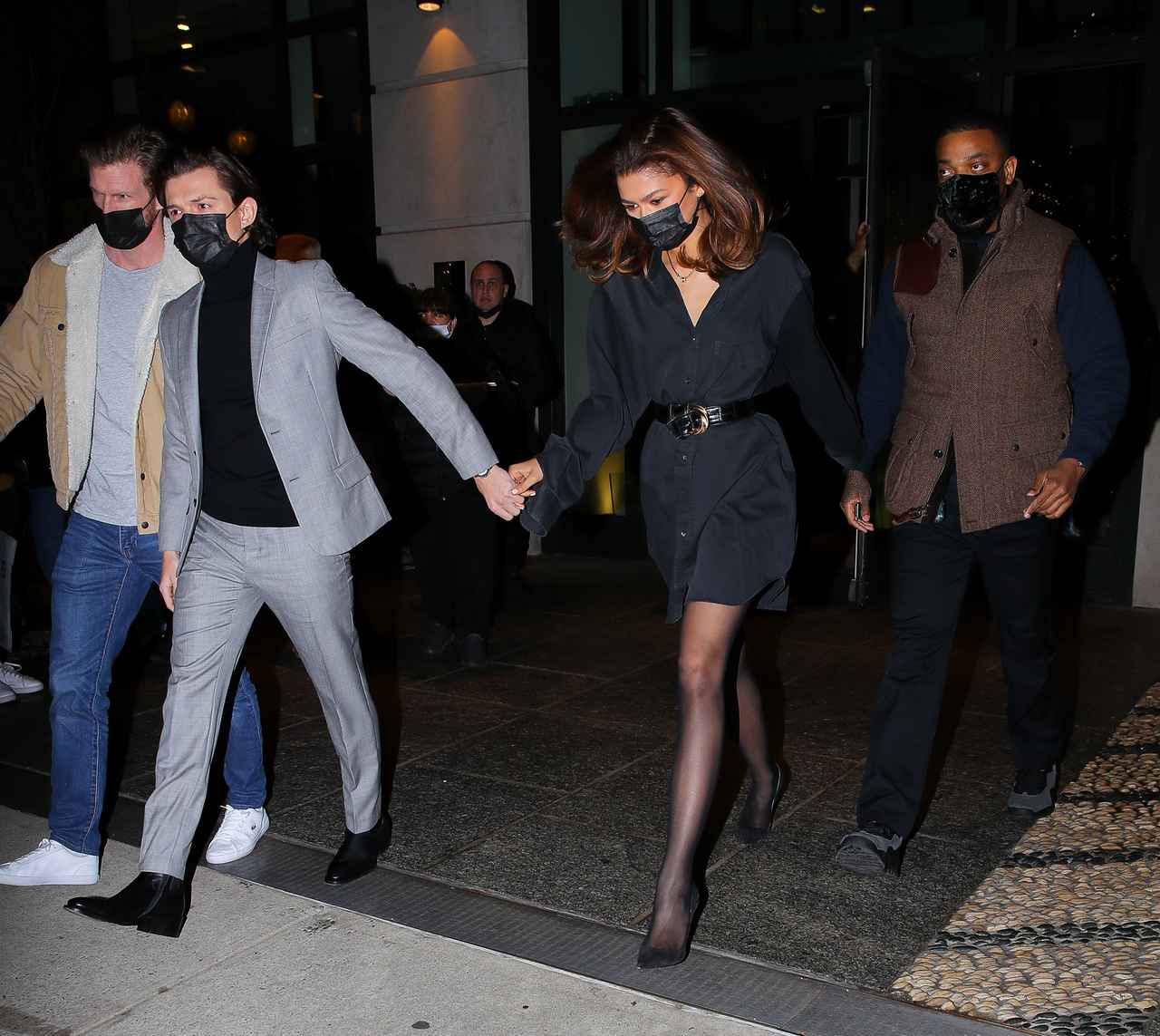 トムは黒のタートルネックにグレーのスーツを合わせ、ゼンデイヤは黒のシャツワンピにシアータイツとパンプスを合わせた。2人はマスクも黒でそろえており、エレガントな雰囲気の漂うデートナイトに。