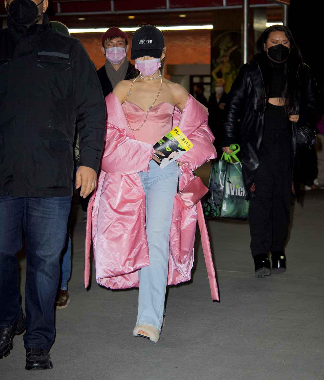 コート、ビスチェ、バッグ、どのアイテムもそれぞれ違うブランドにもかかわらず、上手に同系色にまとめたアリアナは、マスクまでベビーピンクに。シルキーな輝きのアイテムの中にデニムとキャップを投入し、ストリートライクに仕上げて。