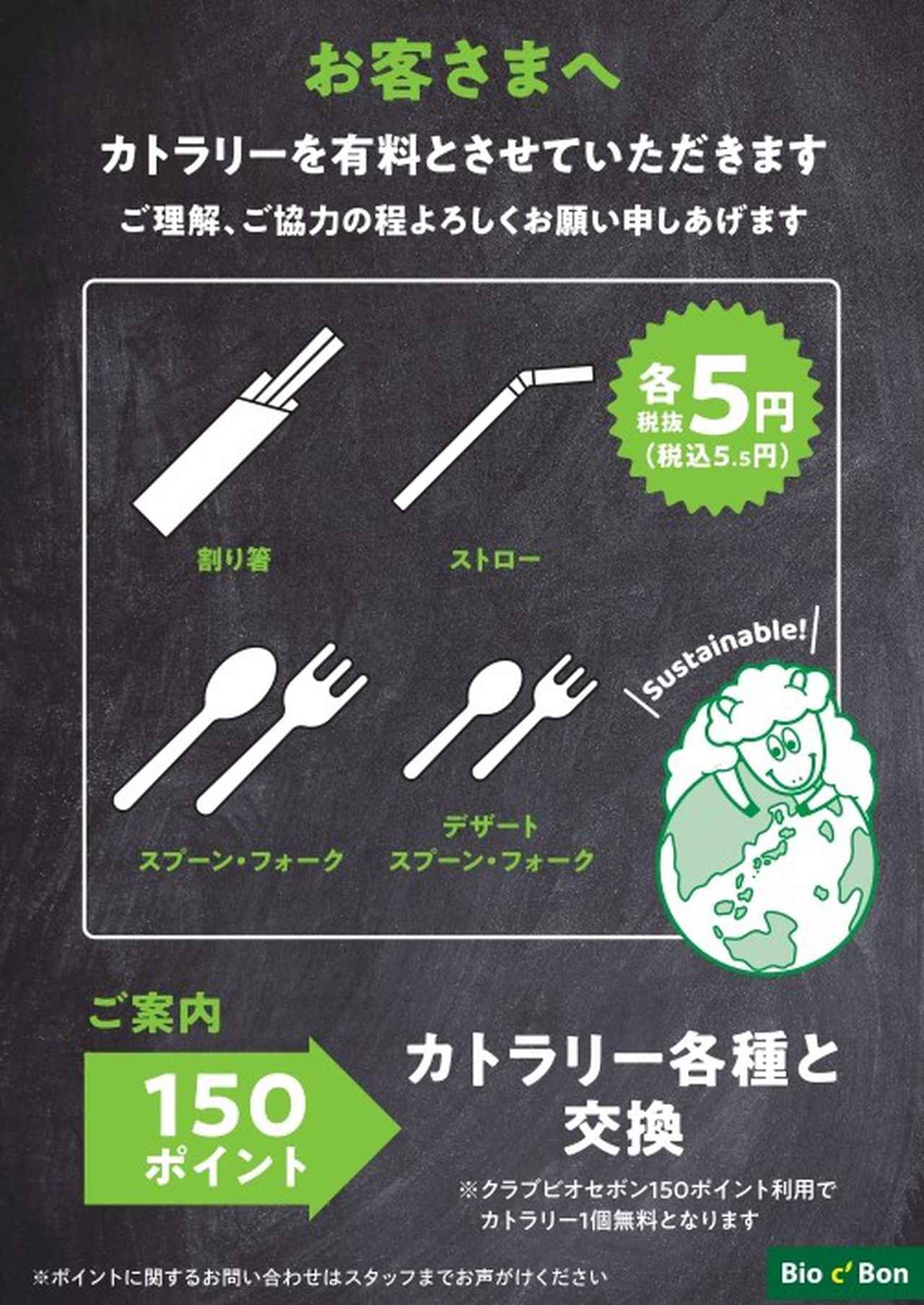 そんなビオセボンが、2022年4月1日に施行予定の「プラスチックに係る資源循環の促進等に関する法律(プラスチック資源循環促進法)」という新法を踏まえ、カトラリーの仕様変更と有料化を発表。