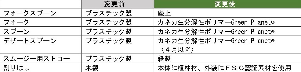 プラスチック製カトラリーの廃止および素材変更対象物一覧