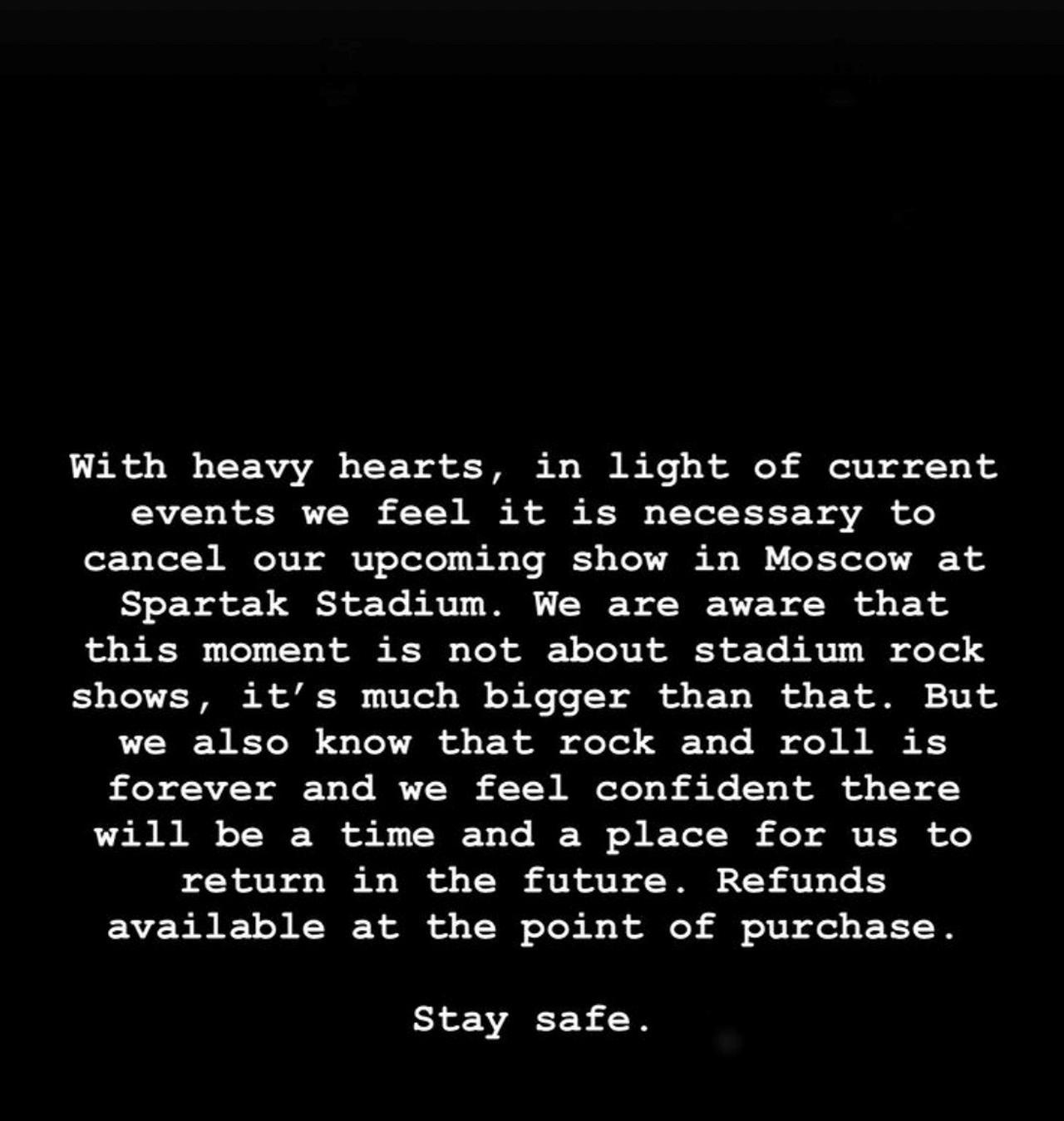5月にロシアのモスクワで公演を行なう予定だった、人気ロックバンドのグリーン・デイは、現在の状況を見てコンサートを中止すると発表し、「重い気持ちながらも、現在の出来事を考慮し、モスクワのスパルタク・スタジアムで行われる予定の公演をキャンセルする必要があると感じています。我々は、今はスタジアムでのロックショーよりもずっと大きなものの時間であることを認識しています。でも、ロックンロールは永遠であることも知っていますし、将来、僕らが戻ってくる時と場所があることを確信しています。払い戻しは購入した場所でできます。安全でいてください」と、インスタグラムのストーリーズでコメント。