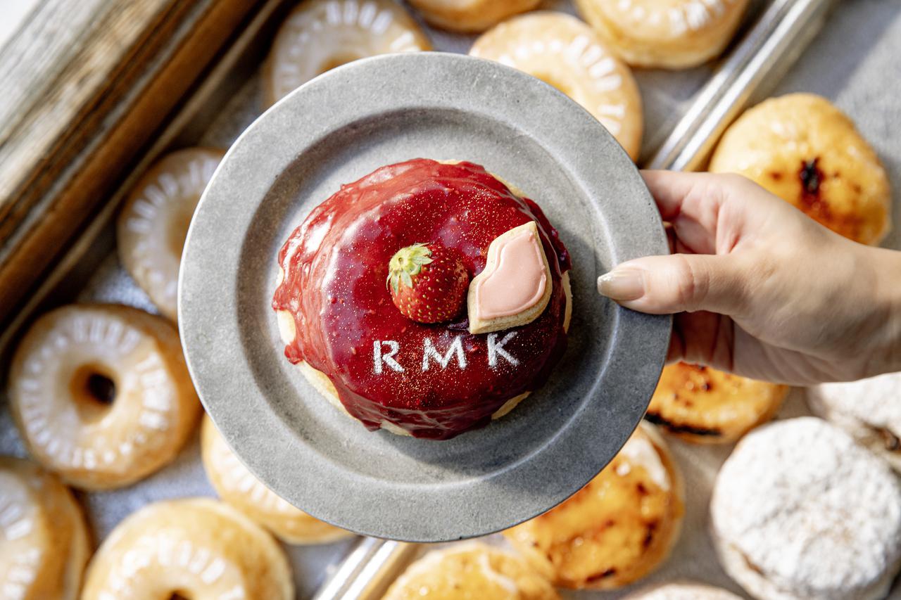 北海道産の小麦を天然酵母で発酵し、オーガニック植物オイルで揚げたふわふわの生地を、ラズベリーの果実とハイビスカスの花びらのフリーズドライパウダーをかけあわせた絶妙な甘酸っぱさのグレーズでコーティング。フレッシュな生のイチゴと、「RMK ザ リップカラー」を纏った唇をイメージしたクッキーとともに、アニバーサリーを祝し金箔がきらめく。