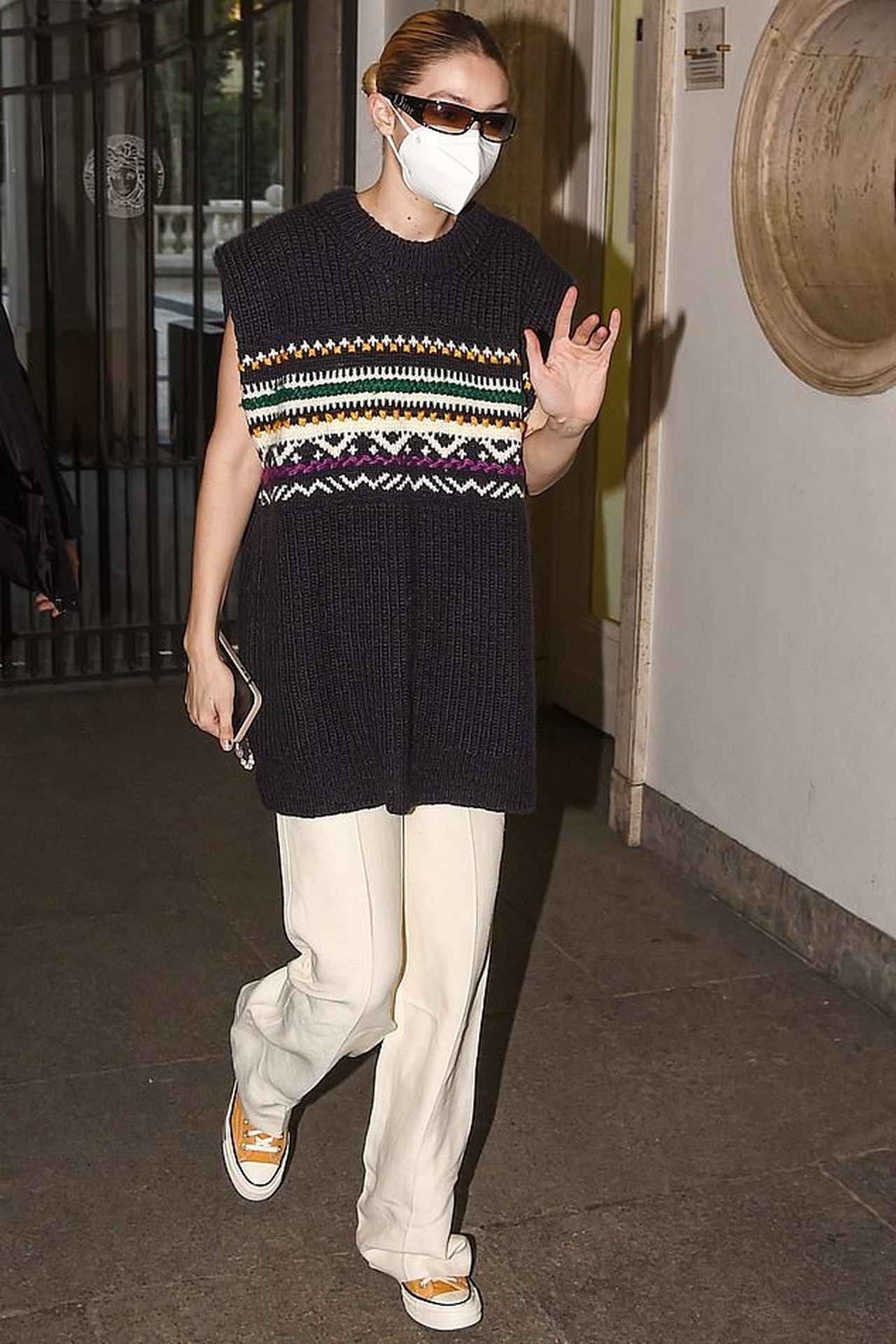 トップモデルのジジ・ハディッドは、オーバーサイズのニットにパンツを合わせ、足元にはニットのイエローステッチとリンクさせたマスタードカラーのチャックテイラーを合わせた上級者コーデ。