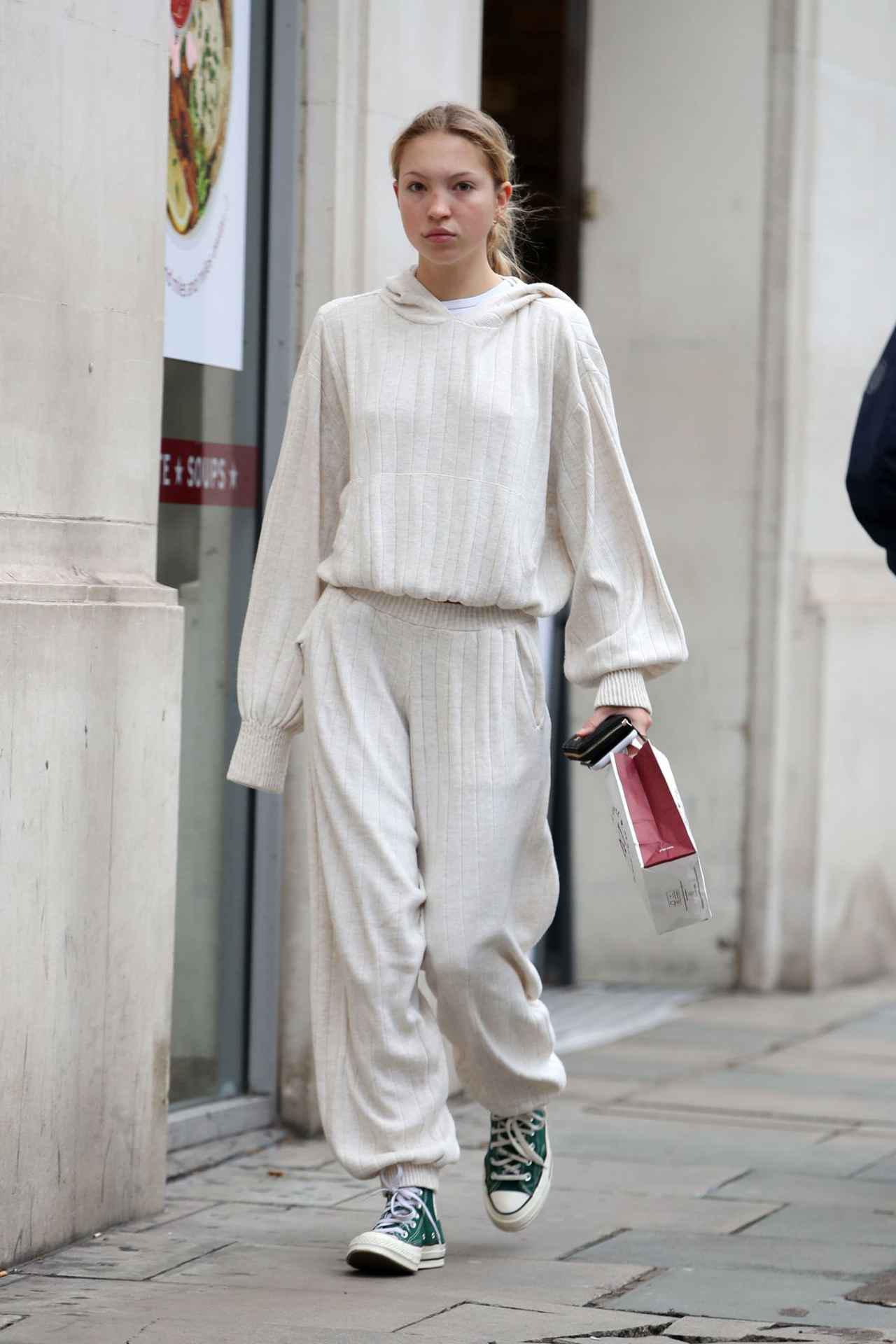 トップモデルのケイト・モスの愛娘でモデルのライラ・グレース・モスは、ホワイトニットのセットアップの足元に、チャックテイラーの鮮やかなグリーンでアクセントを置いて。