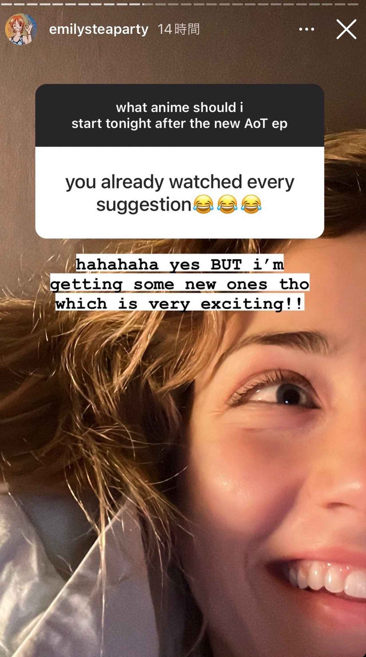鑑賞済みの作品リストが膨大であることについて、「おすすめ全部観たことあるじゃん」とファンから突っ込まれると、「ハハハ。でも(観たことがない)新しいアニメもいくつか届いているから、ワクワクしてる!」とエミリー。